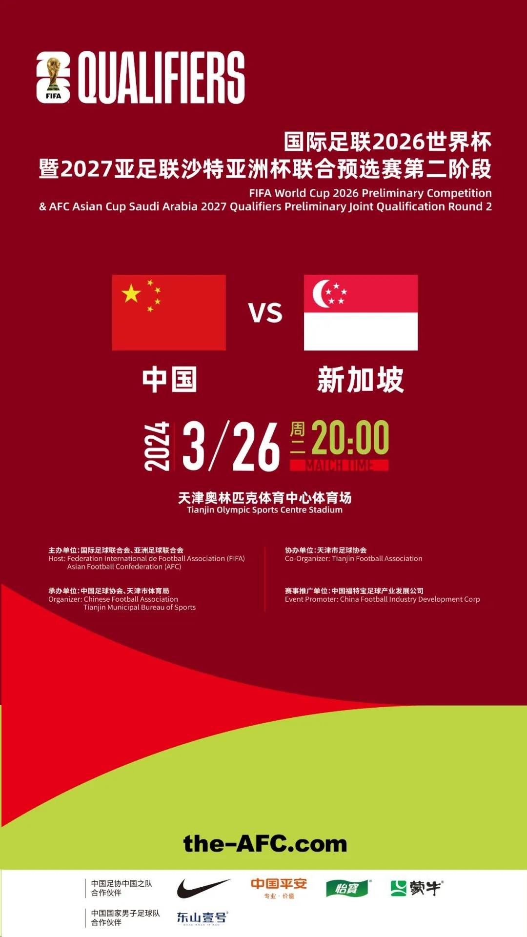 中国足协官宣文件显示,国足与新加坡队的主场比赛,将于3月26日晚8点举行。根据亚足联的安排,2026美加墨世界杯亚洲区预选赛与2027沙特亚洲杯预选赛合并举办。在36强赛阶段,国足与泰国、韩国以及新加坡队同组。在2023年进行的小组赛前两轮比赛中,国足客场2比1击败泰国队,主场0比3负于韩国队。