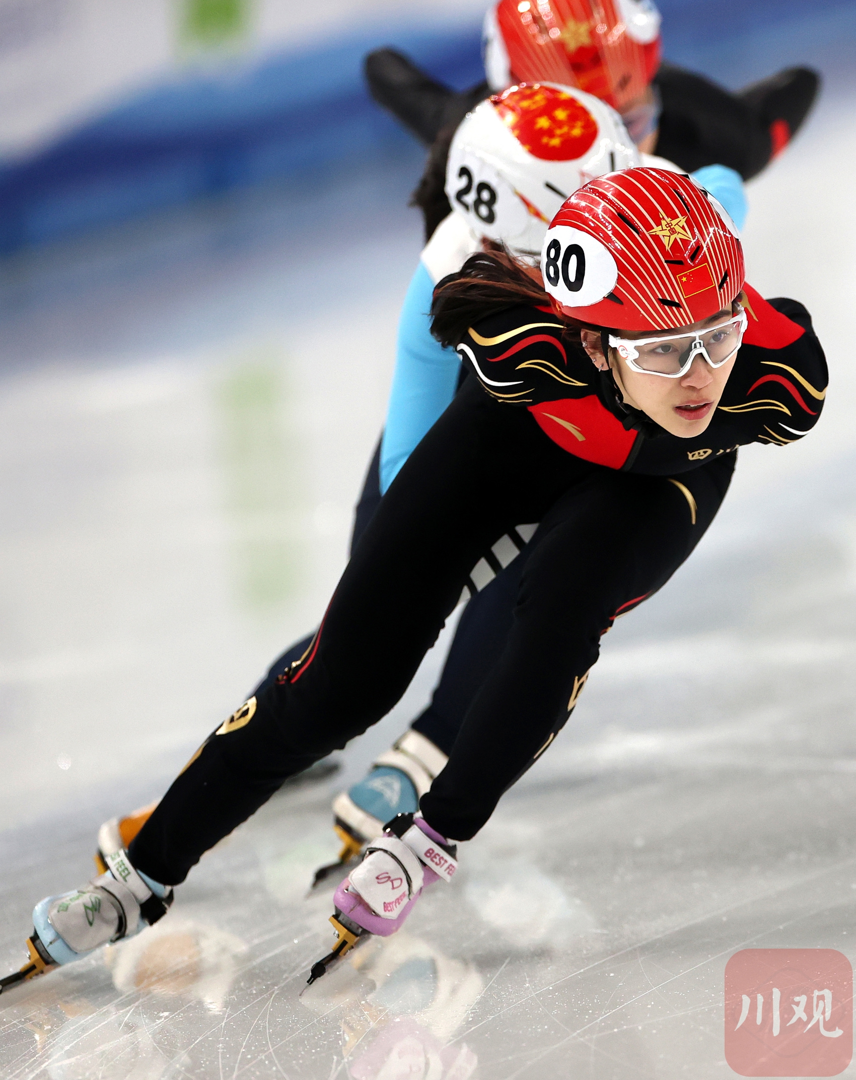 戴着大熊猫手环的四川女子选手在1000米速滑比赛前