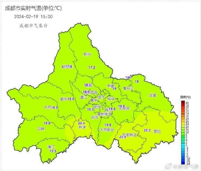 今日上午,成都还是出了一会太阳,体感有一点热。截至15时,成都均温19.2℃,气温17.2℃(彭州)~20.8℃(东部新区)。