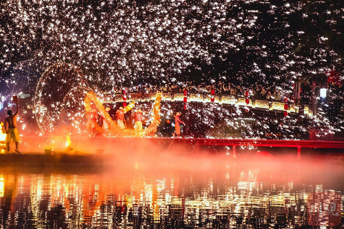 春节期间黄龙溪古镇热闹非凡,传统民俗活动火龙灯舞壮观绚丽,精彩夺目。