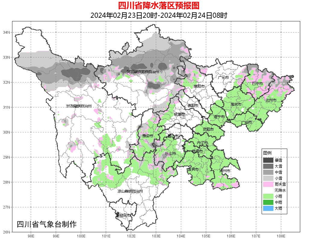 今天晚上:盆地各市阴天,部分地方有小雨,其中盆地东北部和高海拔山区有雨夹雪或小雪;阿坝州大部和甘孜州北部阴天间多云有阵雪(雨),局部地方有中到大雪,川西高原其余地方多云,有分散的阵雪(雨);攀西地区大部多云间晴,其中凉山州北部阴天有阵雨(雪)。