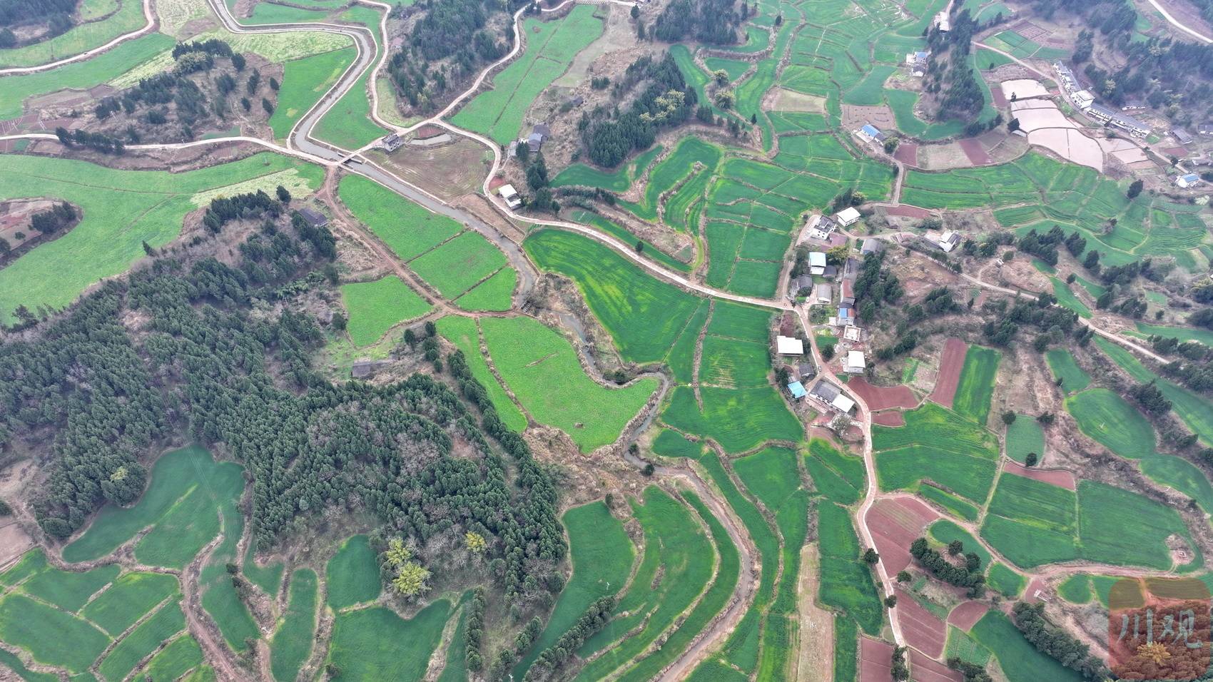 2024年2月24日,在南充市嘉陵区金宝镇积善社区高处俯瞰,昔日撂荒地如今长满了小麦,变成了绿色的海洋。
