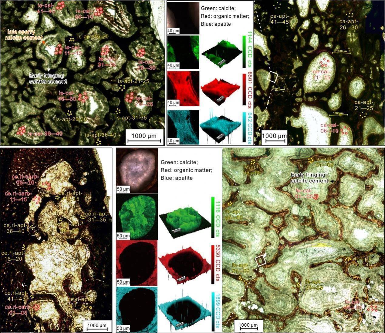 “既然化石骨骼空隙中存在方解石胶结物,能否从上面寻求突破?”说干就干,齐靓利用多台仪器,观察到骨骼样品切片上的方解石呈清晰的圈层结构,干净无杂质,这说明方解石的胶结过程并没有受到太多干扰,很适合进行U-Pb定年分析。