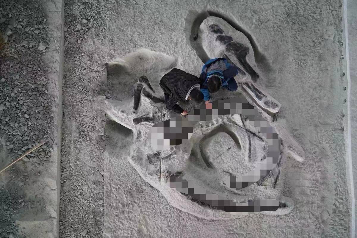 一边揭去围岩暴露骨骼,一边通过绘图、拍照全面记录埋藏的原始信息,研究团队还首次在野外挖掘阶段翻制了化石的埋藏状态模型。随后,在距离化石本体至少15厘米的位置,斜向下开出发掘槽,将沾了水的草纸贴在化石表面,用调制好的石膏浆糊上一层,混合竹片、麻袋,又耐心糊上另一层。待石膏固化后,沿着发掘槽敲打,直至整块岩石从基岩中分离,再用类似的方法制作成一个个石膏包。发掘团队一共制作了33个保护化石的石膏包。
