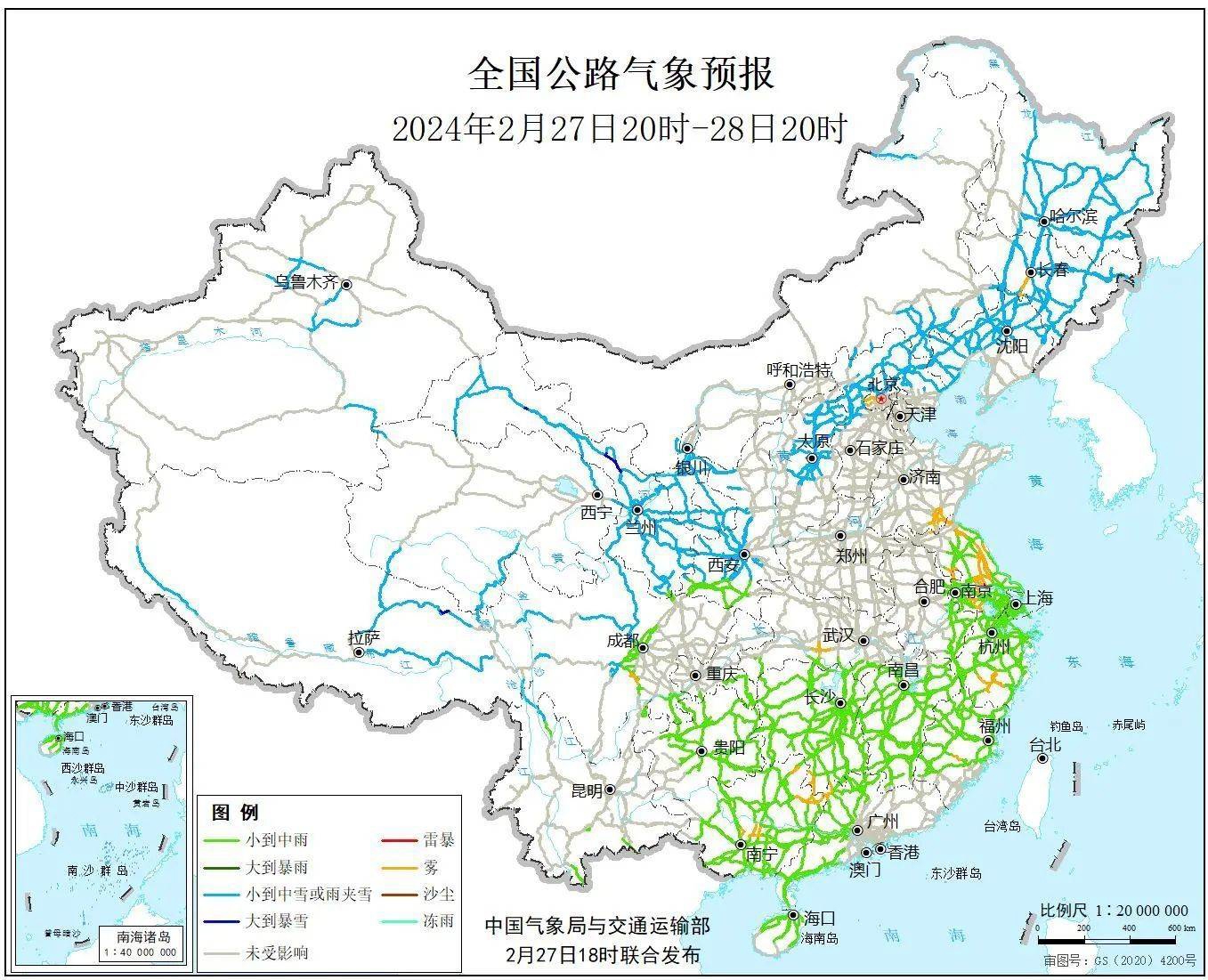 2月27日20时至28日20时,内蒙古西北部和东部、东北地区大部、新疆南疆盆地东部、西藏东部和北部、西北地区中东部、华北北部和西部、川西高原北部等地部分地区有小到中雪或雨夹雪,其中,西藏东部、甘肃中西部等地局部地区有大雪。江淮东部、江南、西南地区东部、华南中西部等地部分地区有小雨,局地中雨。另外,北京西南部、吉林中部、山东南部、江苏中南部和东北部、浙江南部、福建中部、湖北南部、广西中部和东北部、四川东部等地局地有雾。
