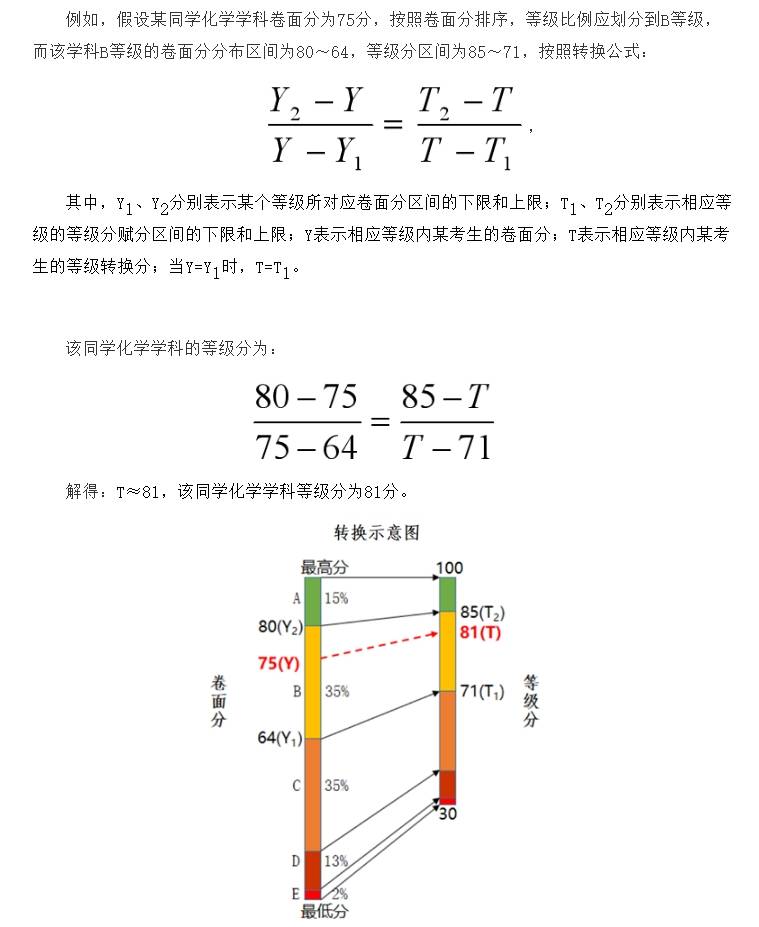 答:等级赋分以30分作为赋分起点,满分为100分。将思想政治、地理、化学、生物每门选择性考试科目考生的原始分从高到低划分为A、B、C、D、E共5个等级,各等级人数所占比例分别约为15%、35%、35%、13%和2%。将A至E等级内的考生原始成绩,按照等比例转换规则,转换到100~86,85~71,70~56,55~41和40~30五个分数区间,根据转换公式计算,四舍五入取整数得到考生的等级转换分。转换后的成绩1分1档,考生排序不变。