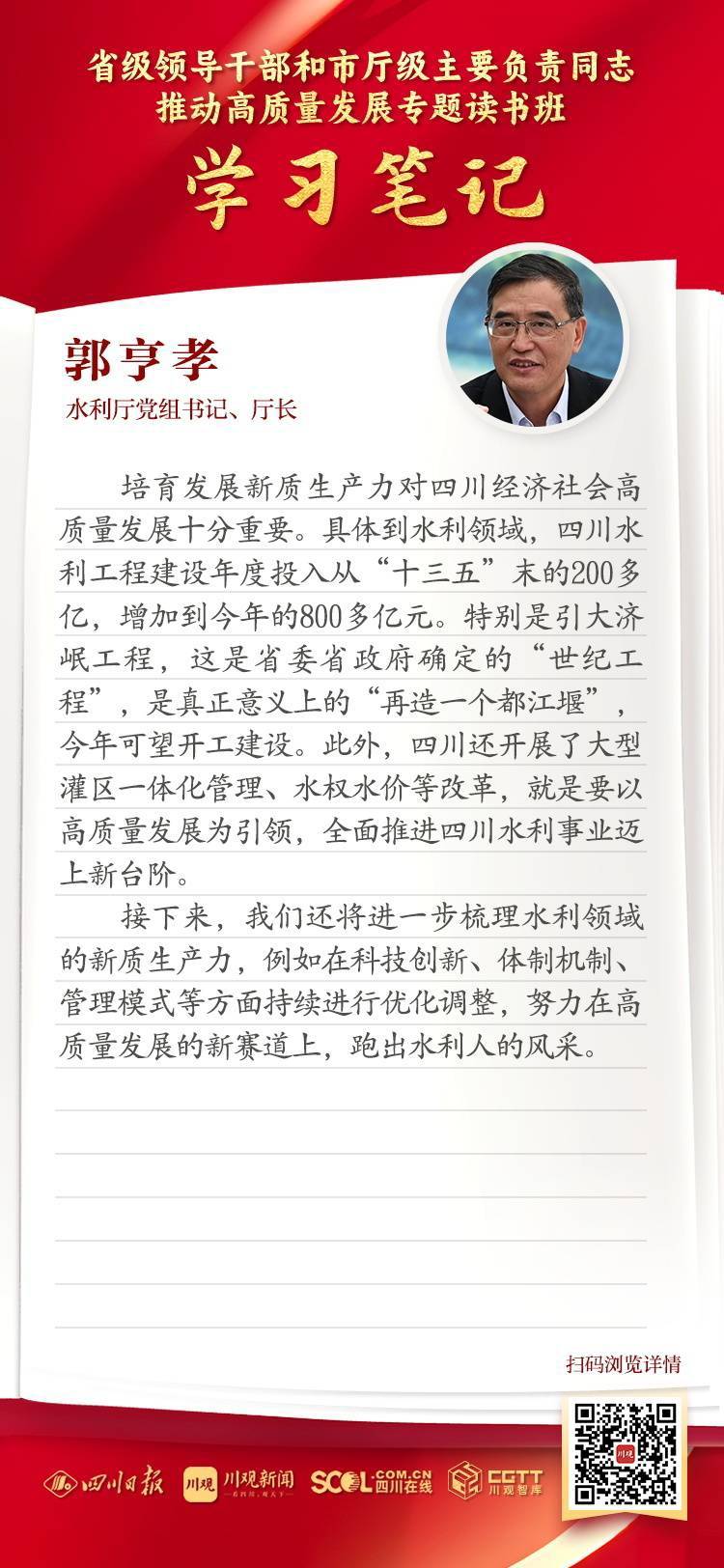 培育发展新质生产力对四川经济社会高质量发展十分重要。具体到水利领域,四川水利工程建设年度投入从“十三五”末的200多亿,增加到今年的800多亿元。特别是引大济岷工程,这是省委省政府确定的“世纪工程”,是真正意义上的“再造一个都江堰”,今年可望开工建设。此外,四川还开展了大型灌区一体化管理、水权水价等改革,就是要以高质量发展为引领,全面推进四川水利事业迈上新台阶。
