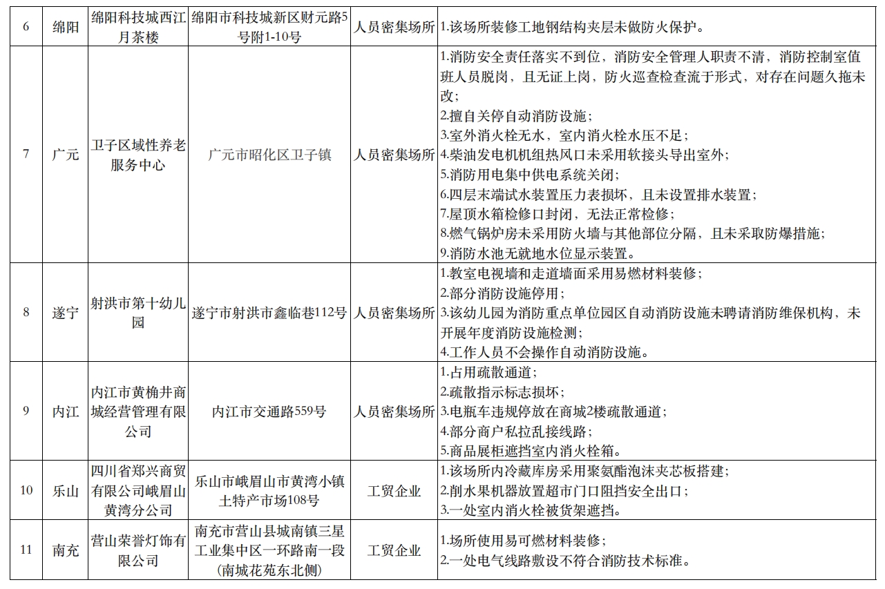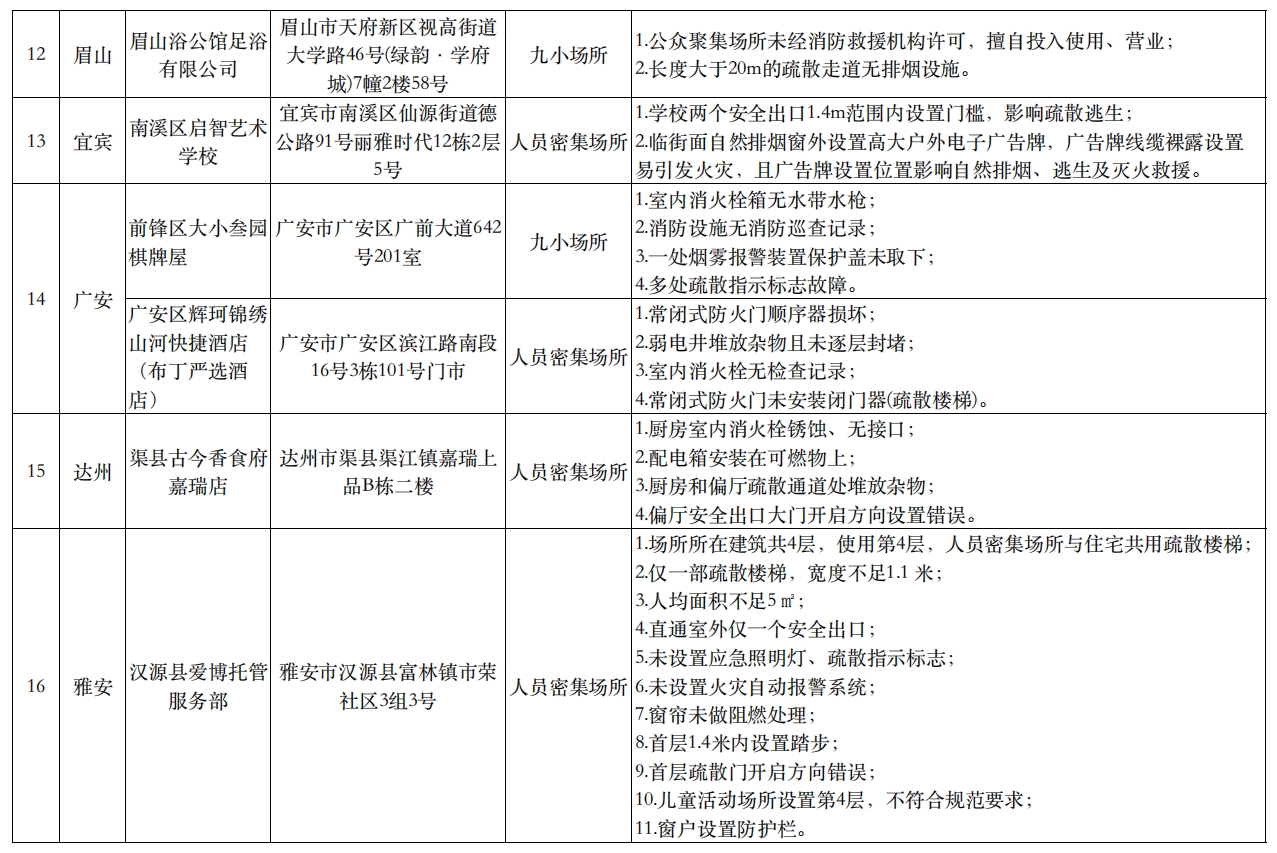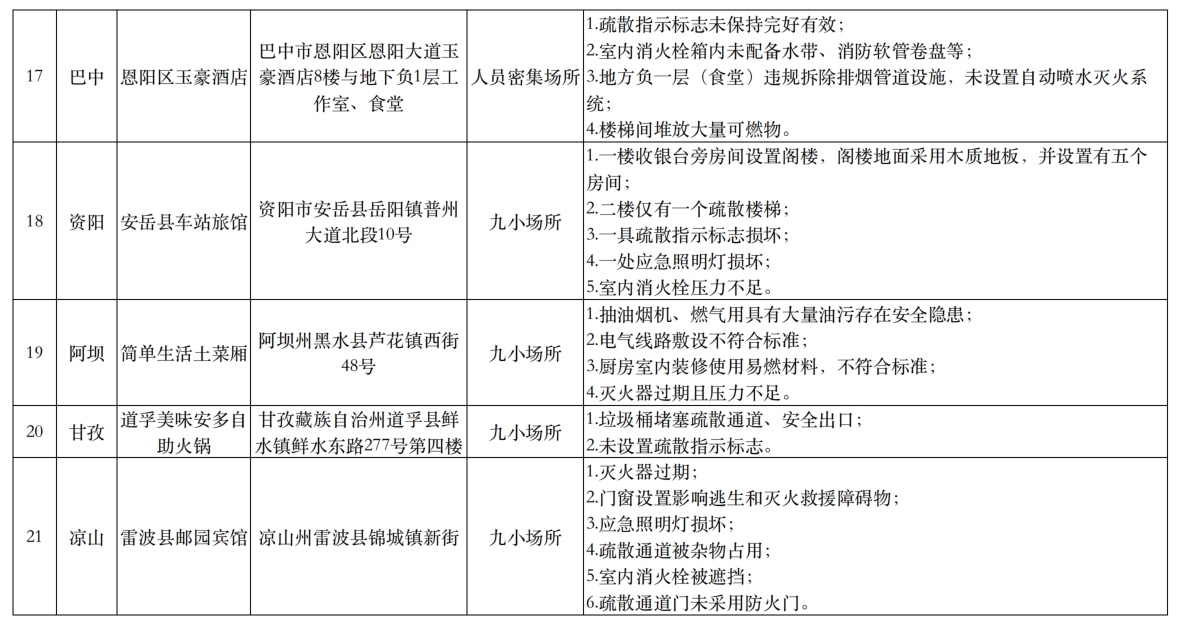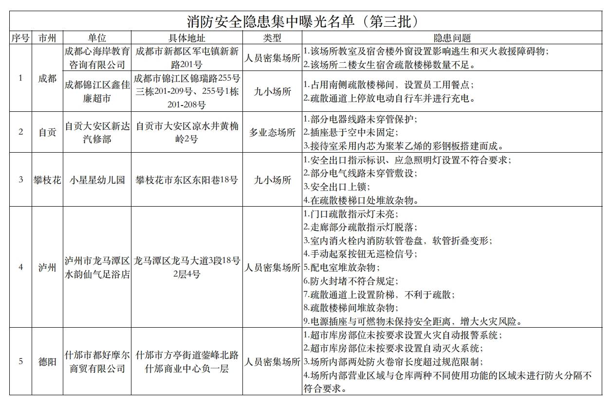 消防隐患排查整治,不只电动自行车。连日来,四川各地持续推进消防安全集中除患攻坚大整治行动,针对典型问题进行曝光。3月1日,“问政四川·消防隐患大曝光”栏目公布来自全省21个市州的23家消防隐患单位,针对发现的问题,消防部门已督促相关单位和责任人进行整改。