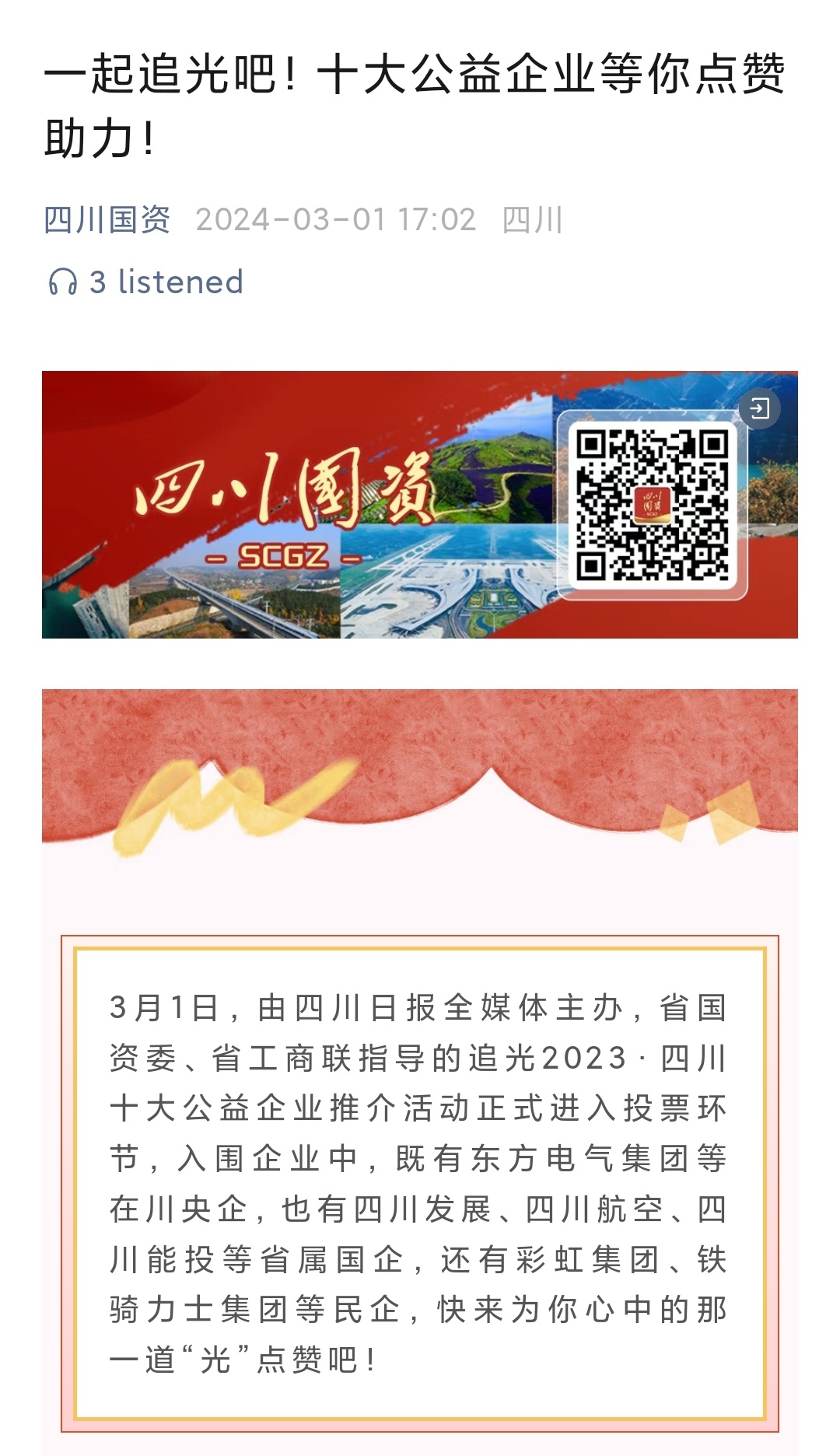 当天,四川省国资委官方微信公众号“四川国资”也向广大网友发出邀请,一起为心中的那一道“光”点赞,并联动四川日报全媒体,陆续推出省属企业推介案例,介绍四川国资国企的公益事迹。