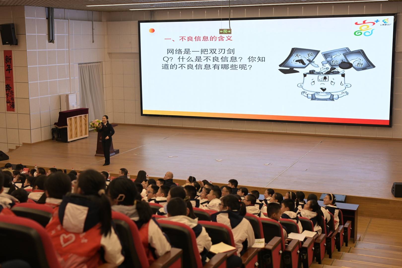 记者在现场注意到,如何正确使用网络,防范来自网络的各类侵害,是当天“开学第一课”上的主要内容。
