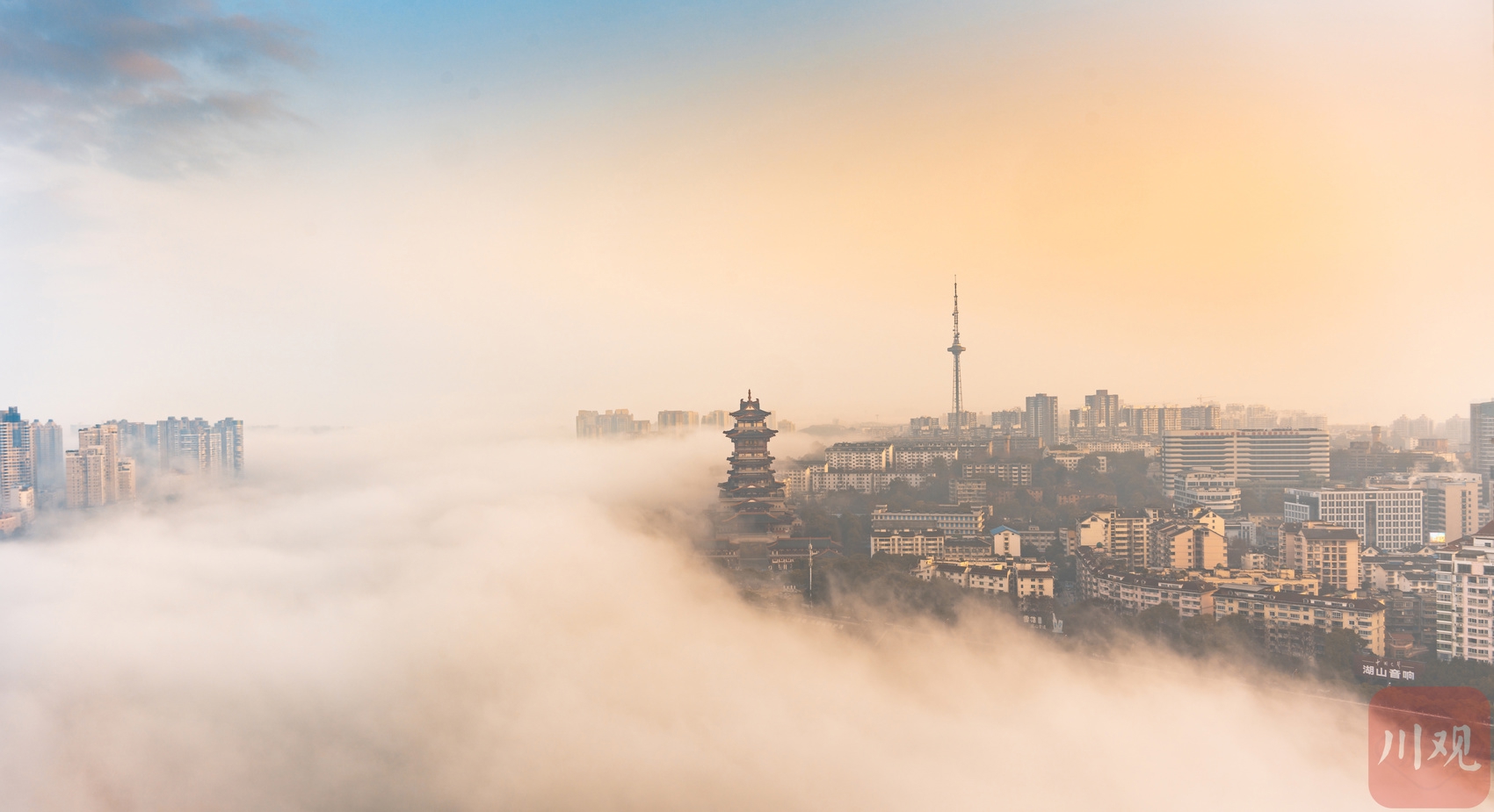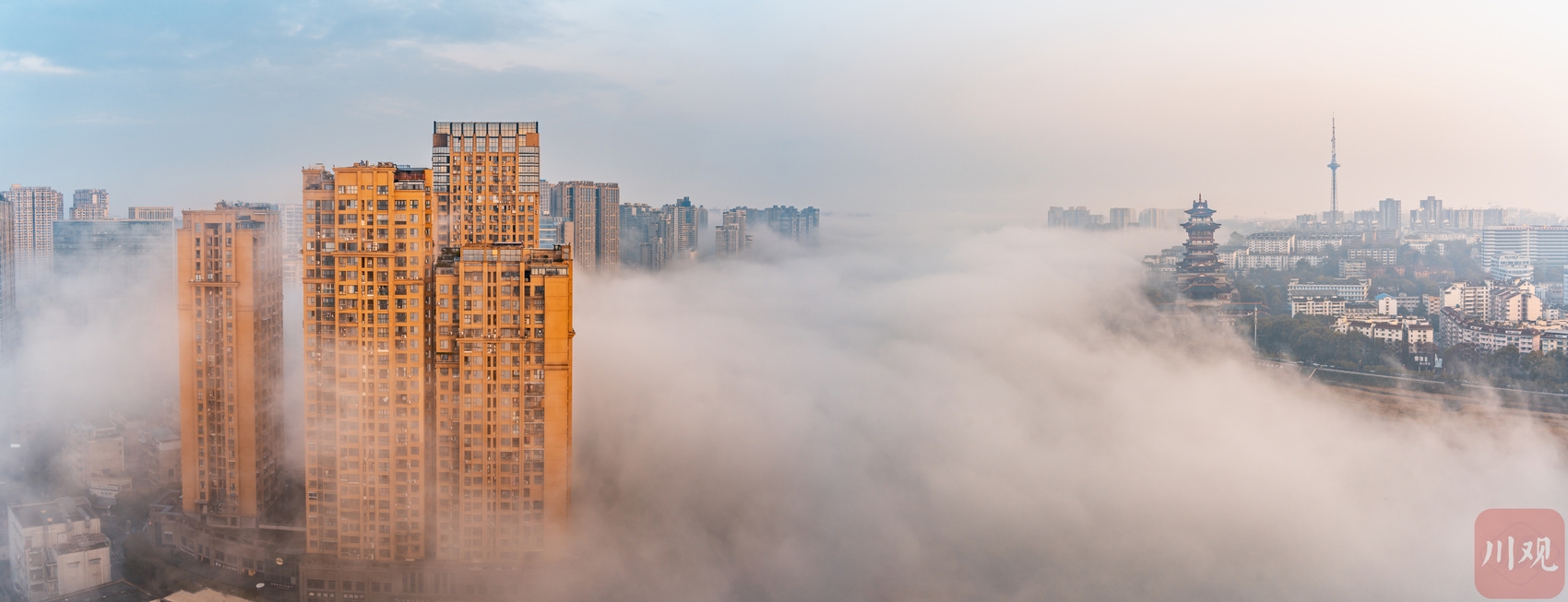 3月2日,绵阳天气晴好,春日朝气满满。清晨的阳光洒满城区,轻纱般的云雾“环抱”着越王楼、富乐大桥、滨江广场,宛若云上之城,美轮美奂。