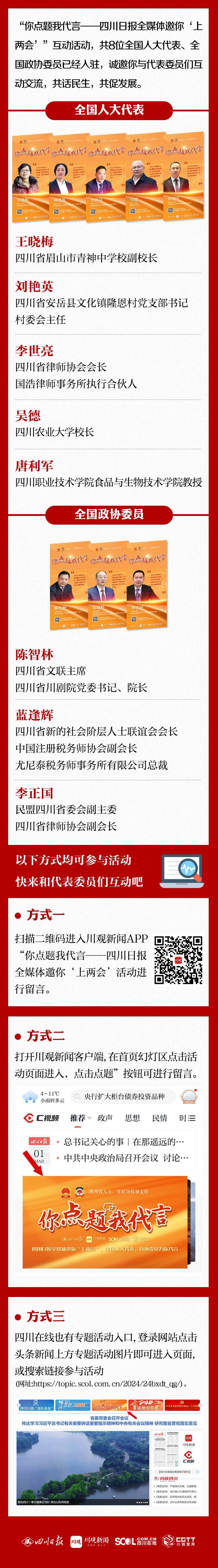 2024年全国两会在即,你最关注的热点话题是什么?对民生改善还有哪些期许?对经济社会发展又有什么好建议?3月1日,四川日报全媒体推出了“你点题我代言——四川日报全媒体邀你‘上两会’”互动活动,诚邀网友与参会的在川全国人大代表、住川全国政协委员们互动交流,共话民生,共促发展。