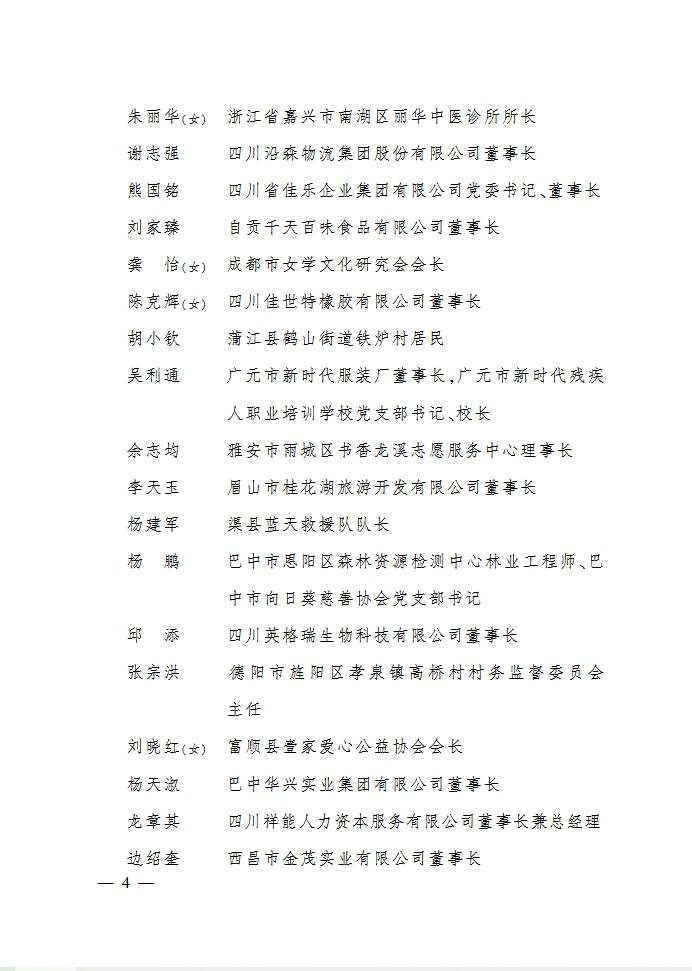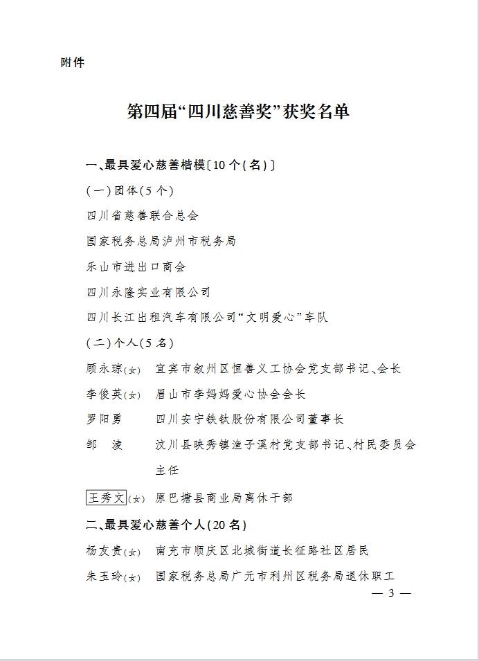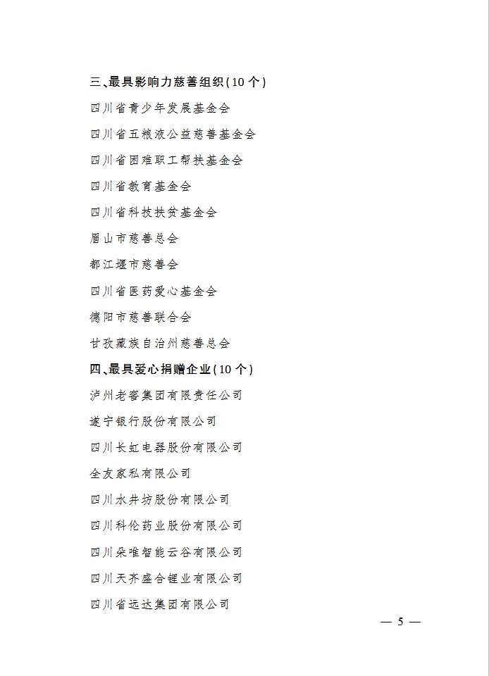 为表彰慈善领域的先进典型,进一步引导社会各界广泛参与公益慈善事业,经有关方面推荐、专家评审、网络投票、社会公示等程序,省政府决定,授予四川省慈善联合总会等10个(名)团体(个人)“最具爱心慈善楷模”称号,杨友贵等20名同志“最具爱心慈善个人”称号,四川省青少年发展基金会等10个慈善组织“最具影响力慈善组织”称号,泸州老窖集团有限责任公司等10家企业“最具爱心捐赠企业”称号,“同一条河、同一个家”爱心帮扶活动等10个项目“最具影响力慈善项目”称号,四川省医学科学院·四川省人民医院眼科等20个(名)团体(个人)“慈善工作奖”称号。