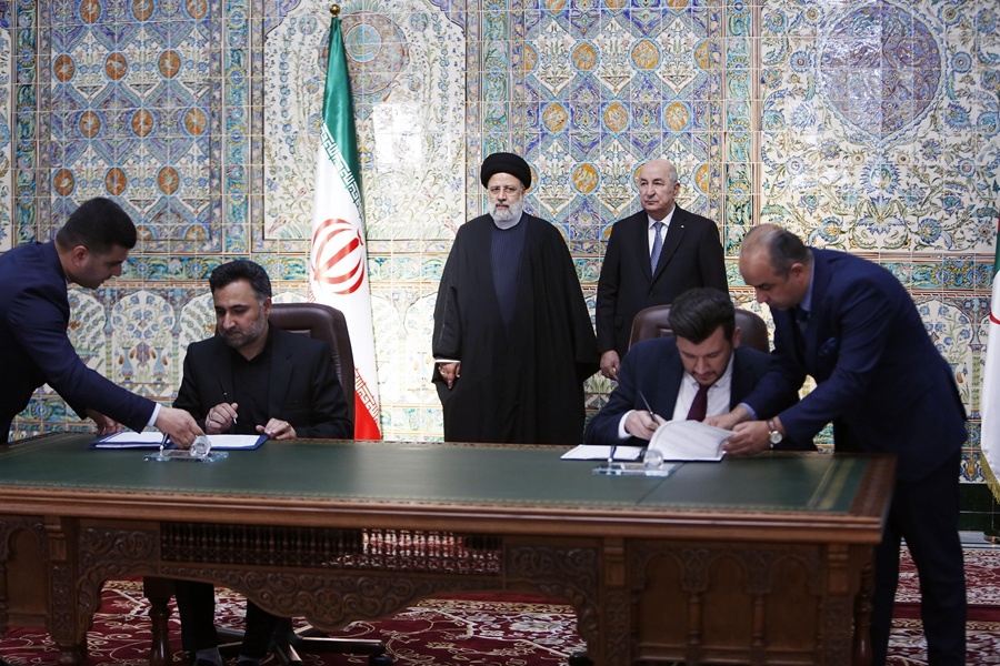 3月3日,在阿尔及利亚首都阿尔及尔,阿尔及利亚总统特本(后右)与伊朗总统莱希(后左)出席合作协议签署仪式。新华社发