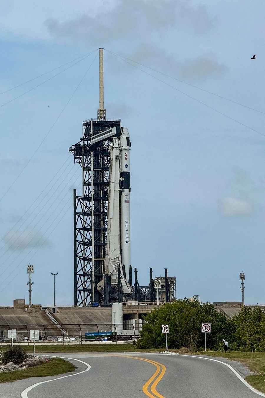 这是3月2日在美国佛罗里达州卡纳维拉尔角的肯尼迪航天中心拍摄的准备发射的太空探索技术公司“猎鹰9”火箭和“龙”飞船。新华社/法新