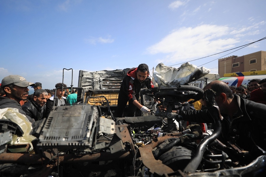 3月3日,在加沙地带中部城市代尔拜拉赫,人们查看遭以军袭击的卡车。新华社发(亚西尔·库迪摄)