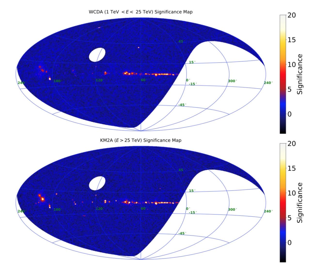 “拉索”第一期星表在1-25TeV和>25TeV能段显著性天图。