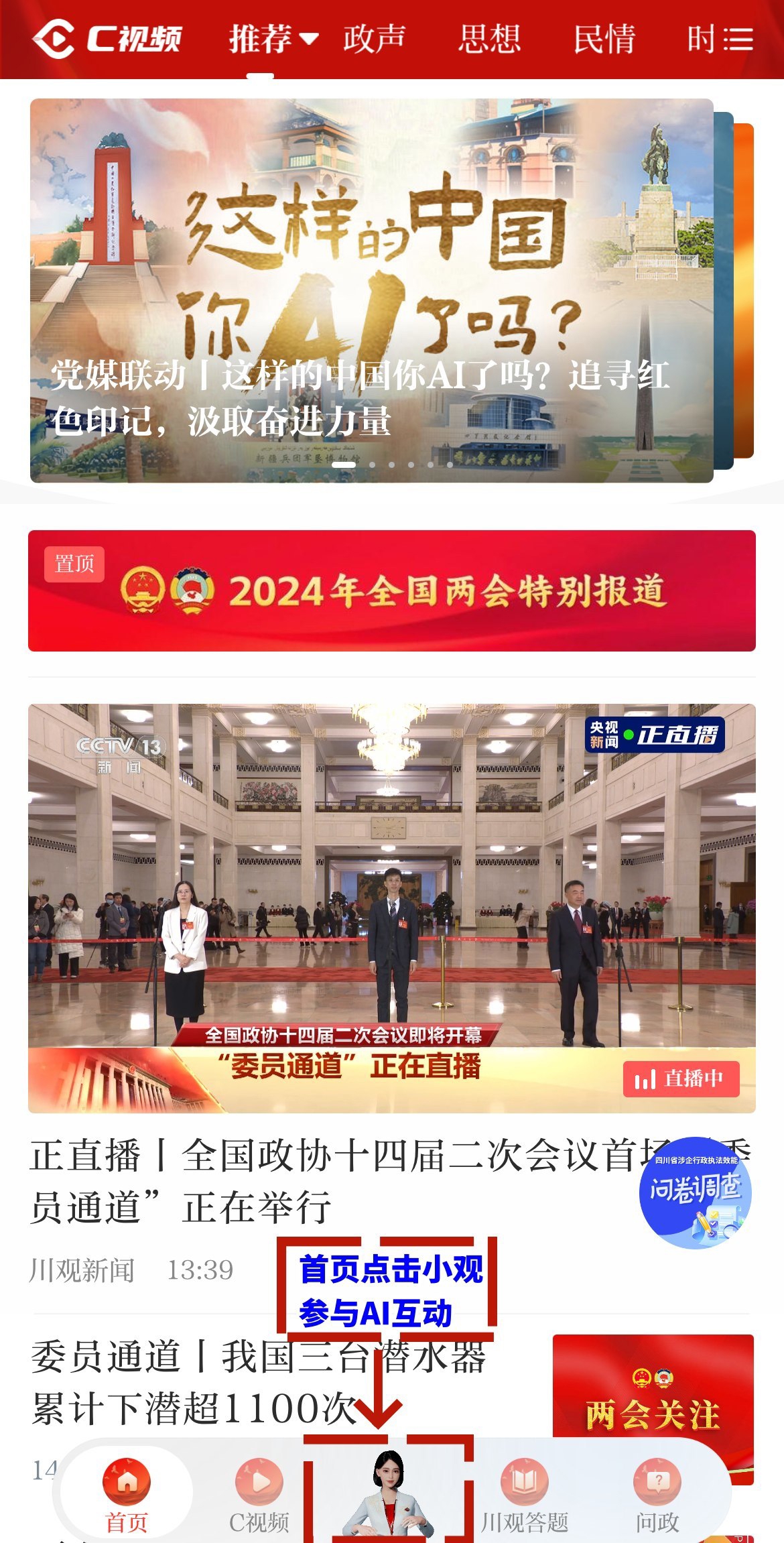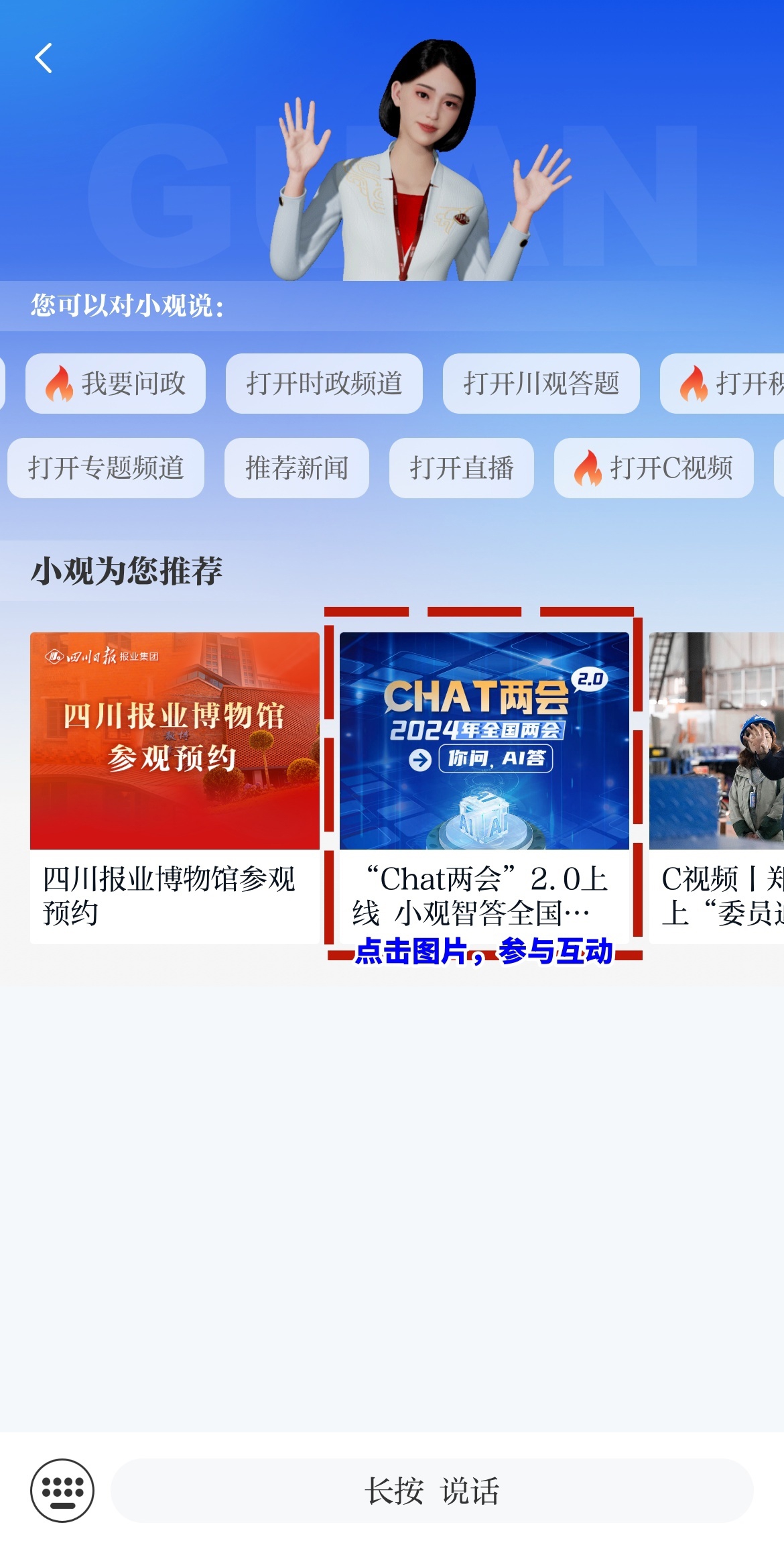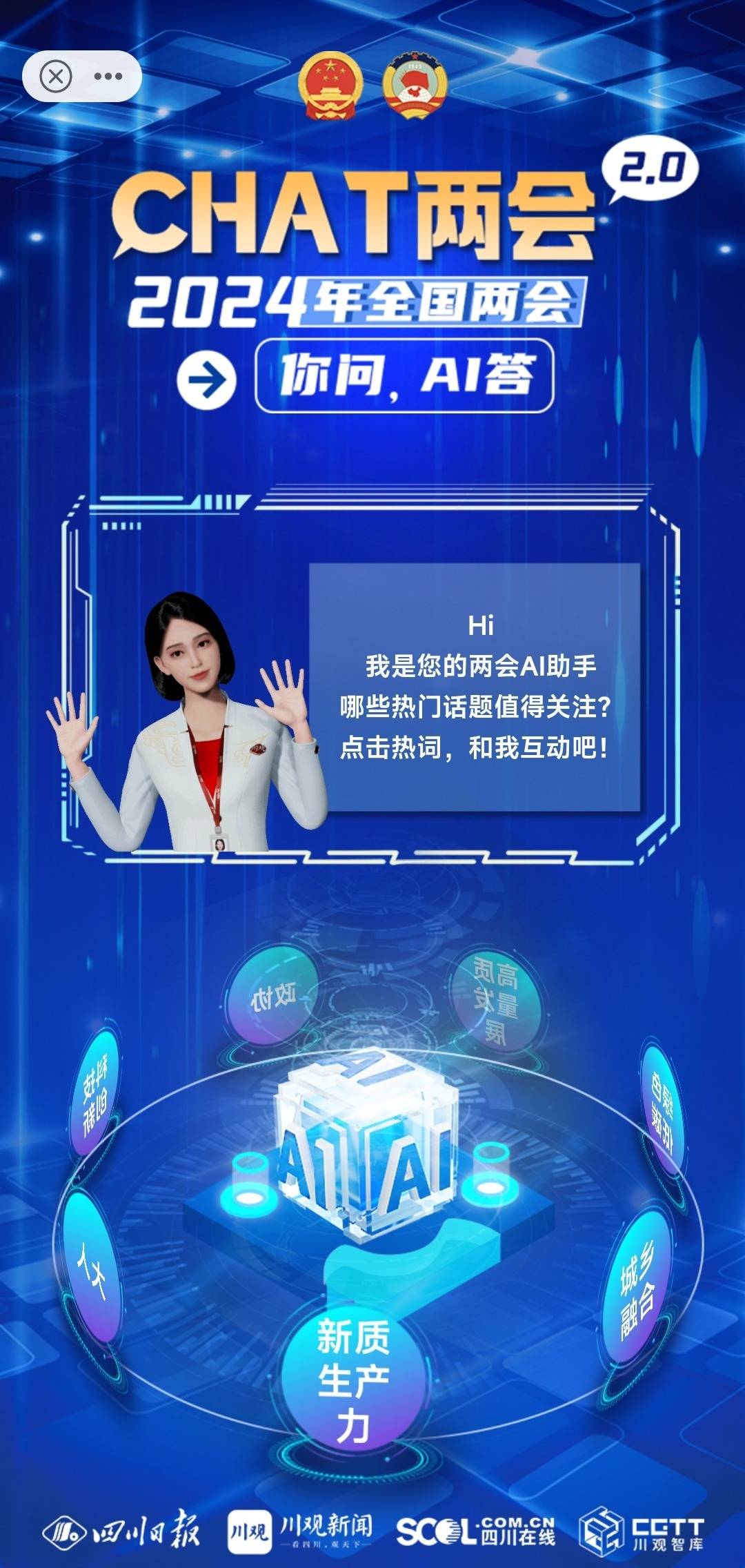 川观新闻自主研发的“Chat两会”AI互动产品2.0版本和大家见面啦。新版本中,川观新闻数字记者小观惊艳亮相,将通过实时互动方式,为广大网友带来更加智能的问答体验。