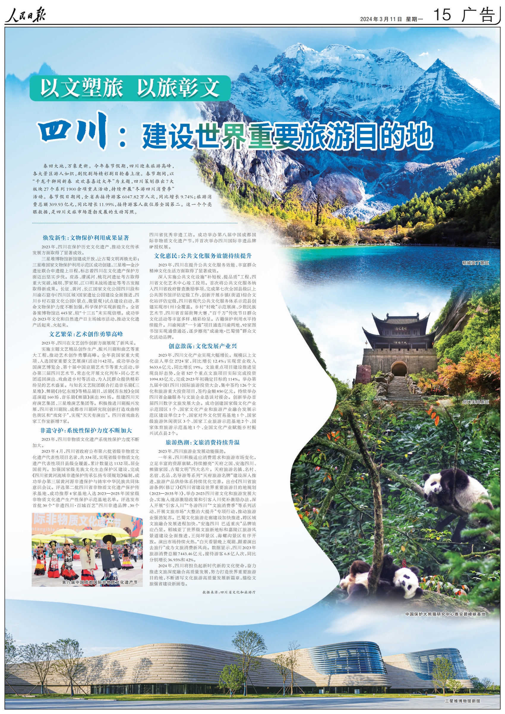 一年来,四川积极适应消费需求和旅游市场变化,立足丰富的资源禀赋,持续擦亮“天府之国、安逸四川、熊猫家园、古蜀文明”四大名片。天府旅游名镇、名村、名宿、名品、名导游等系列“天府旅游名牌”建设深入推进,旅游产品供给体系持续优化完善。出台《四川省旅游条例(修订)》《四川省建设世界重要旅游目的地规划(2023—2035年)》,举办2023四川省文化和旅游发展大会,实施入境游激励政策和引客入川奖补激励办法,深入开展“引客入川”“冬游四川”“文旅消费季”等系列活动,开展文旅市场“大整治大提升”专项行动,推动旅游业强劲复苏。巴蜀文化旅游走廊建设加快推进,跨区域文旅融合发展进程加快,“安逸四川 巴适重庆”品牌效应凸显。稻城亚丁世界级文旅新地标和嘉陵江旅游风景道建设全面推进,王岗坪景区、海螺沟景区有序开放。演出市场持续火热,“白天看景晚上观剧、跟着演出去旅行”成为文旅消费新风尚。数据显示,四川2023年旅游消费总额7443.46亿元,接待游客6.8亿人次,同比分别增长36.93%和42%。