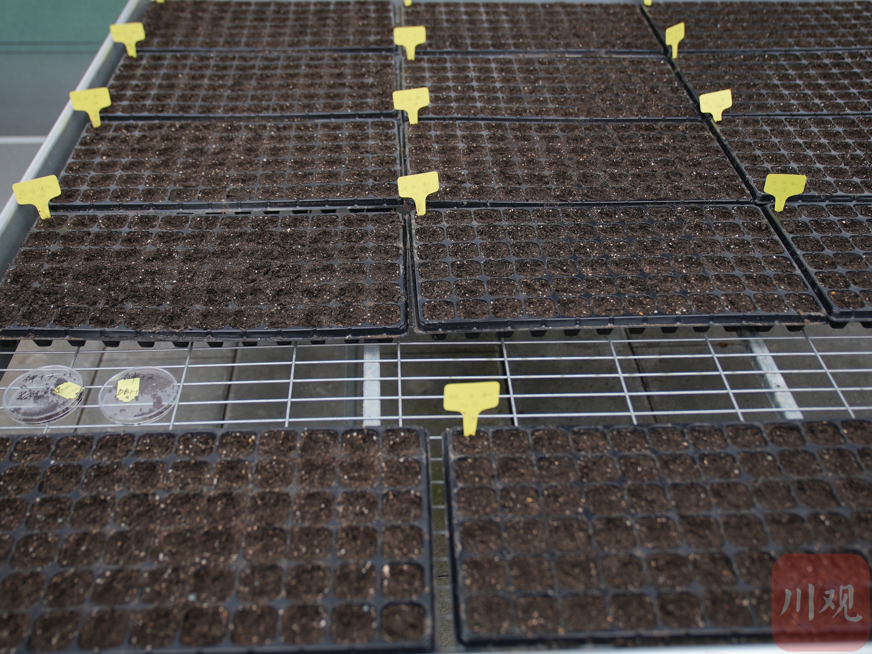 科研苗圃大棚内,科研人员在育苗架上投放“太空芙蓉”种子。