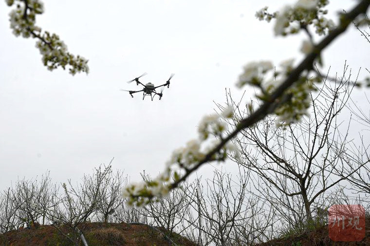 近日,内江市东兴区白合镇华山村“花果山”上,无人机正在对500余亩果树苗进行春季病虫害防治。
