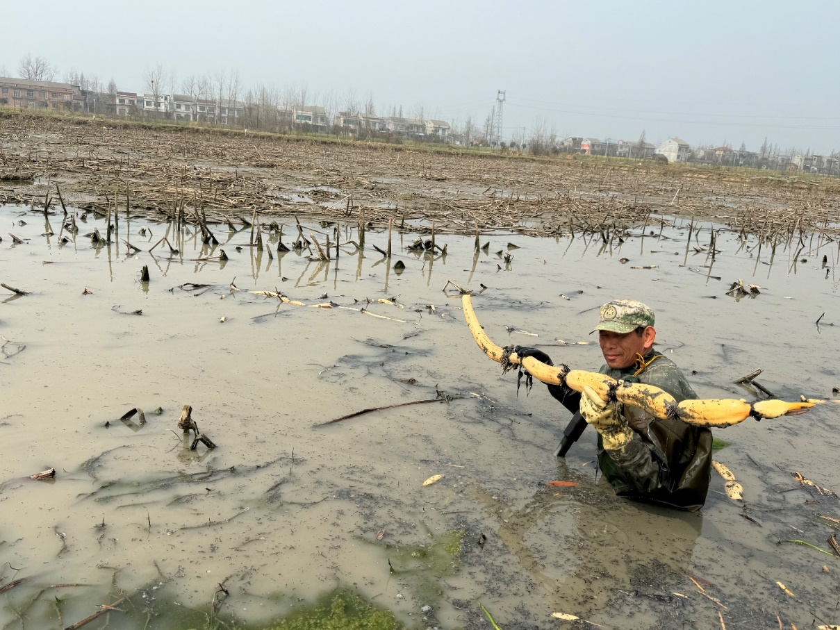 邱珍兵之前在温州一家国企做保安队长。为了赡养父母,邱珍兵回到老家。他看了一圈工作,他们这个年纪拿到的薪资都很低,“每个月也就2000多块钱”,最后决定出苦力挖藕。