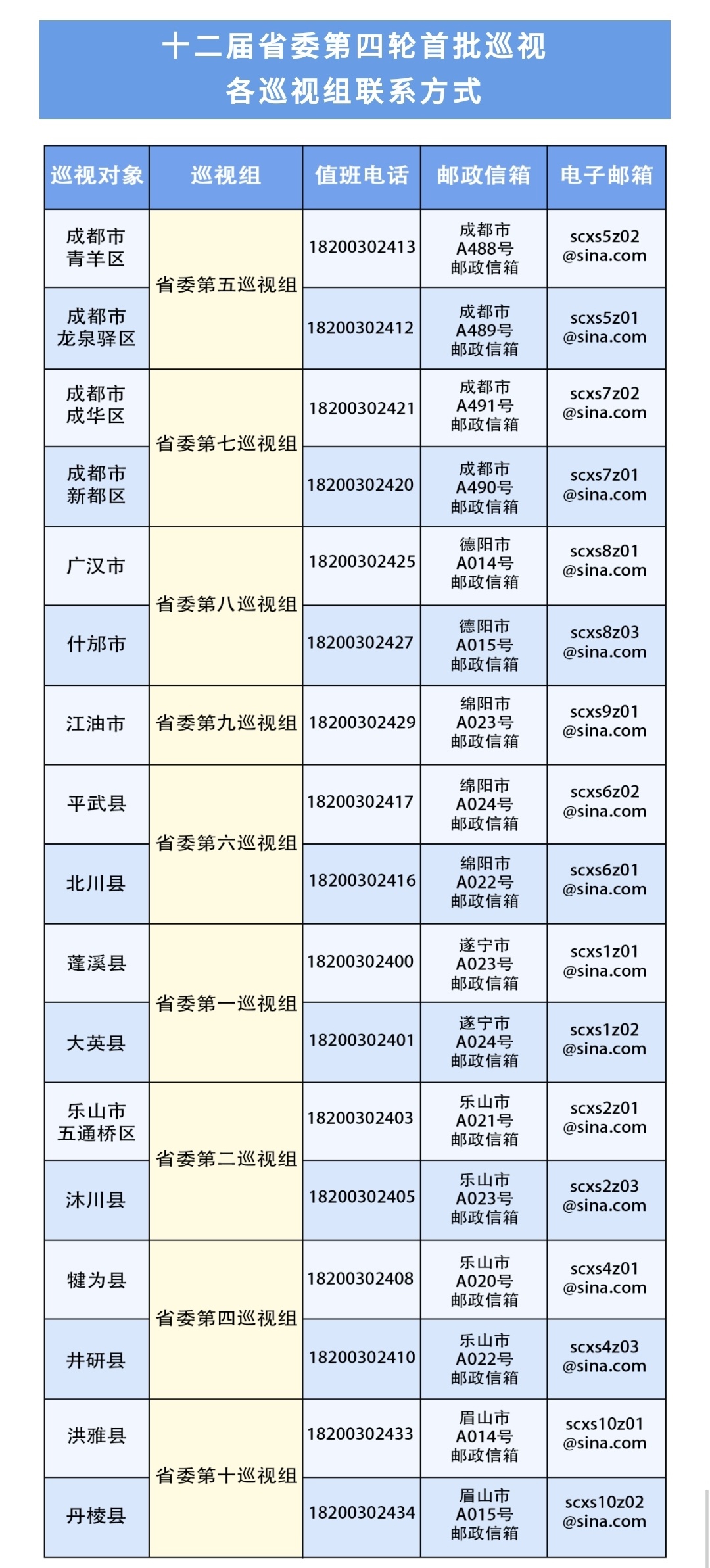 巡视期间,各省委巡视组设置了值班电话、邮政信箱、电子邮箱和“四川码上巡”二维码。巡视组主要受理反映被巡视党组织领导班子及其成员和下一级党组织领导班子主要负责人,以及重点岗位人员问题的来信、来电、来访,重点是关于违反政治纪律、组织纪律、廉洁纪律、群众纪律、工作纪律和生活纪律等方面的举报和反映。对其他不属于巡视受理范围的信访问题,将按规定由被巡视单位和有关部门认真处理。