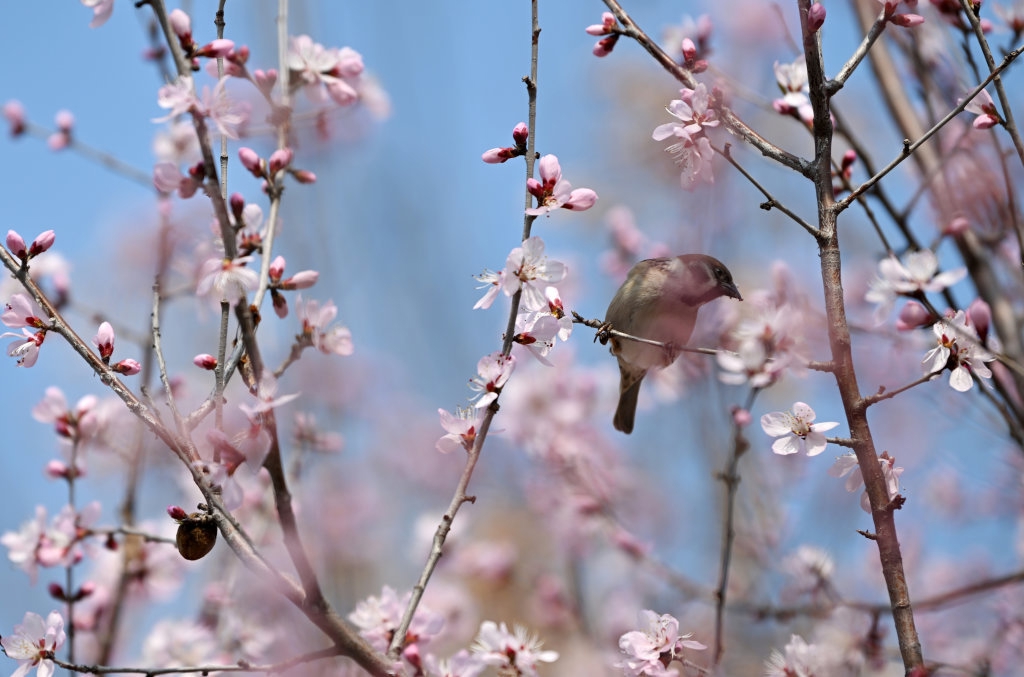 3月15日,一只小鸟在天津桃花堤的桃树枝上休憩。
