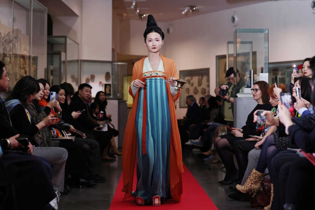 3月13日,在位于法国巴黎的吉美国立亚洲艺术博物馆,模特展示敦煌复原服饰。