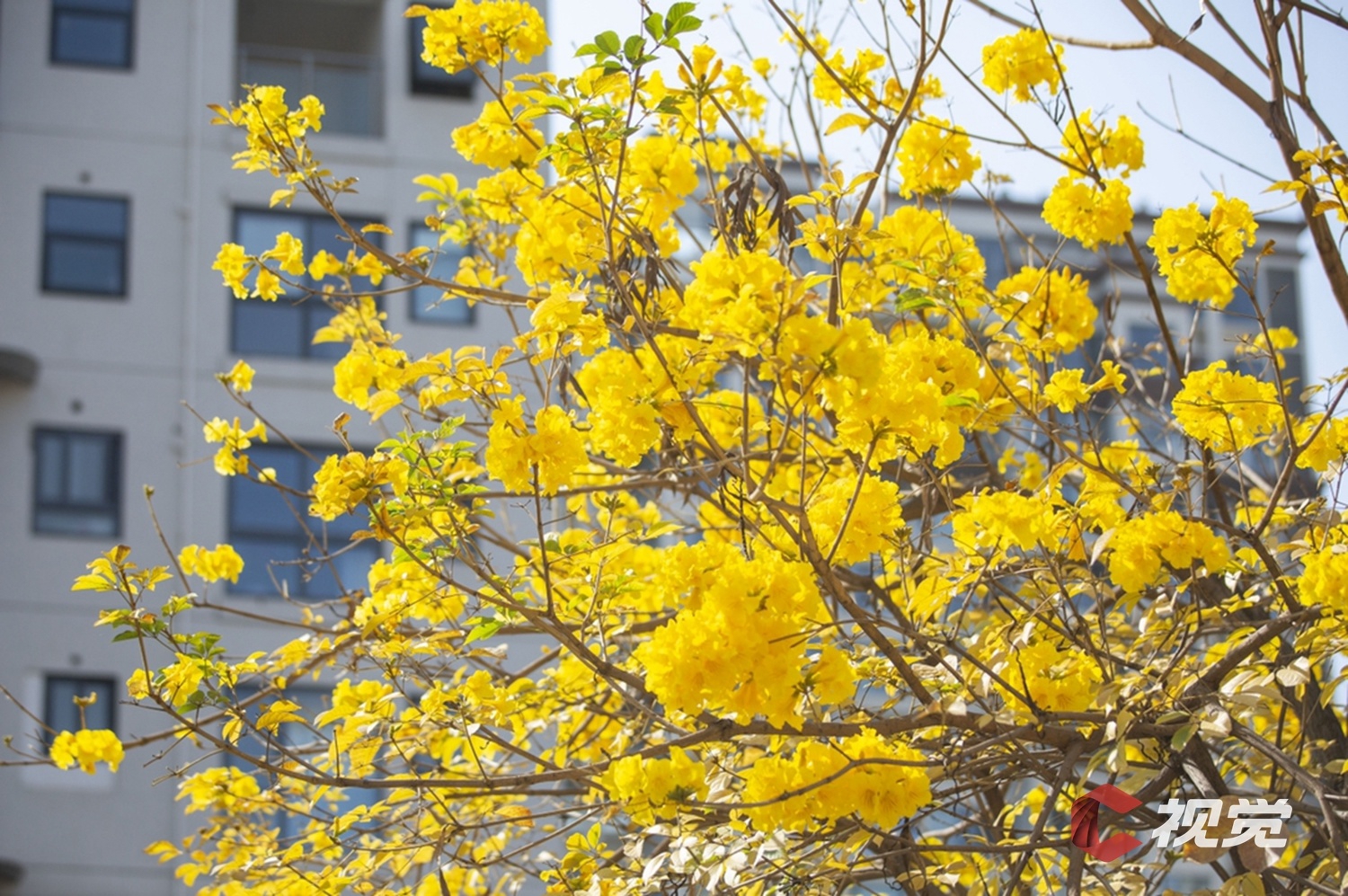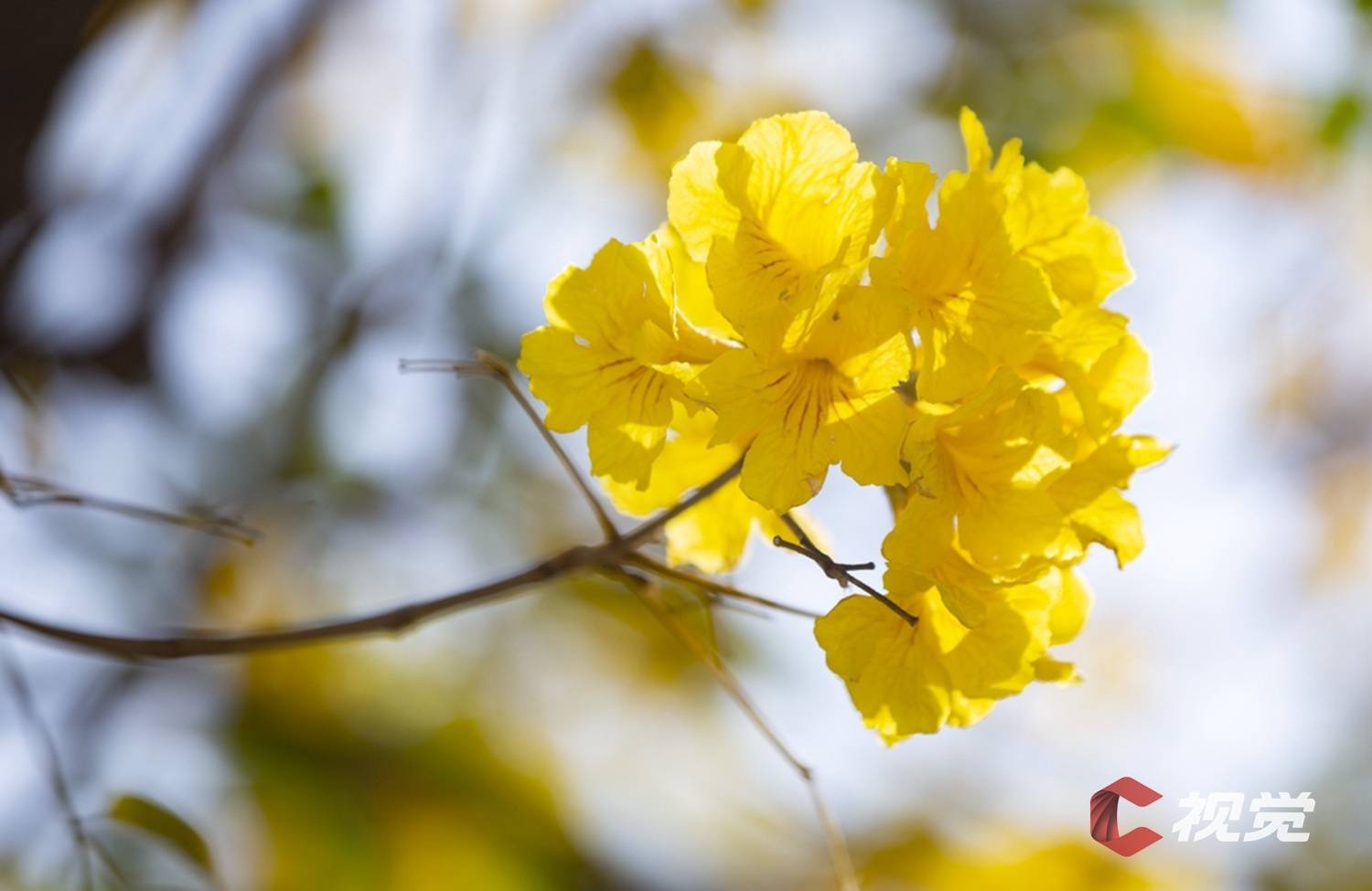 近日,凉山州西昌市天气晴好,月海路上的黄花风铃木迎来了盛花期。“一树金黄一树香,风铃摇醒醉春光”,一年的等待化作此刻花开。