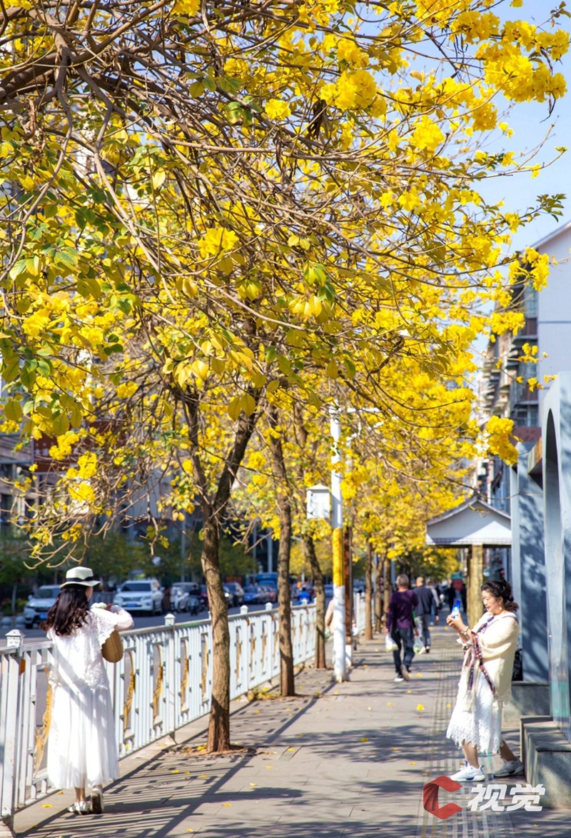 一簇簇、一团团,万盏花朵挂满树梢,炽烈又明媚,将月海路装扮成了金黄“花路”。满树花团随着微风轻摇身姿,每一次摇曳,都洋溢着春天的热情。