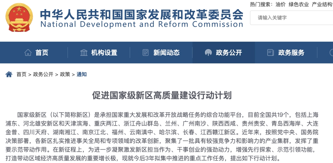 国家级新区(以下简称新区)是承担国家重大发展和改革开放战略任务的综合功能平台,目前全国共19个,包括上海浦东、河北雄安新区和天津滨海、重庆两江、浙江舟山群岛、兰州、广州南沙、陕西西咸、贵州贵安、青岛西海岸、大连金普、四川天府、湖南湘江、南京江北、福州、云南滇中、哈尔滨、长春、江西赣江新区。近年来,按照党中央、国务院决策部署,各新区扎实推进事关全局和专项领域的改革创新,聚集了一批具有较强竞争力和影响力的产业集群,发挥了重要示范带动作用。在新征程上,为进一步凝聚激发新区担当作为、干事创业的强劲动力,增强先行探索、示范引领功能,打造带动区域经济高质量发展的重要增长极,现就今后3年拟集中推进的重点工作任务,提出如下行动计划。