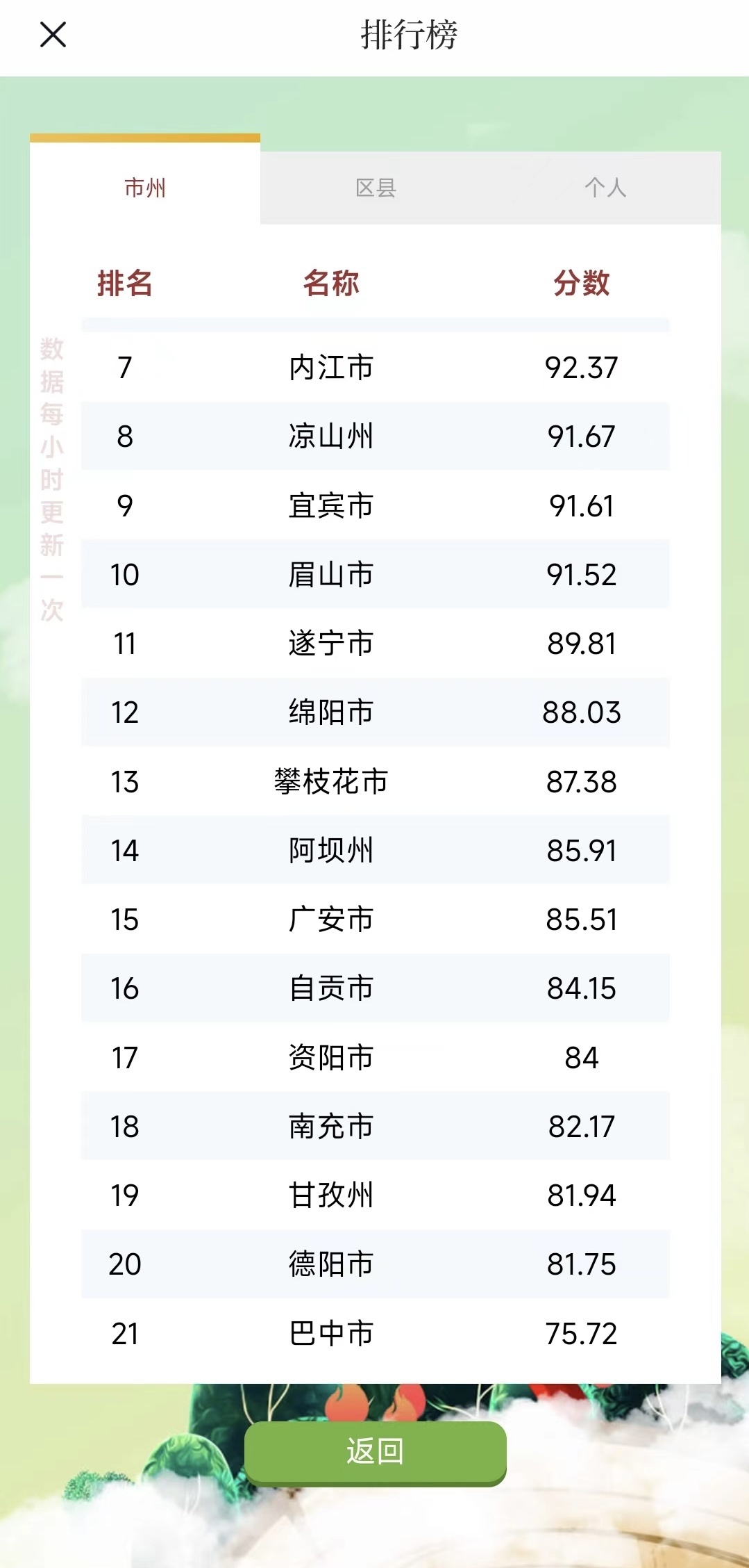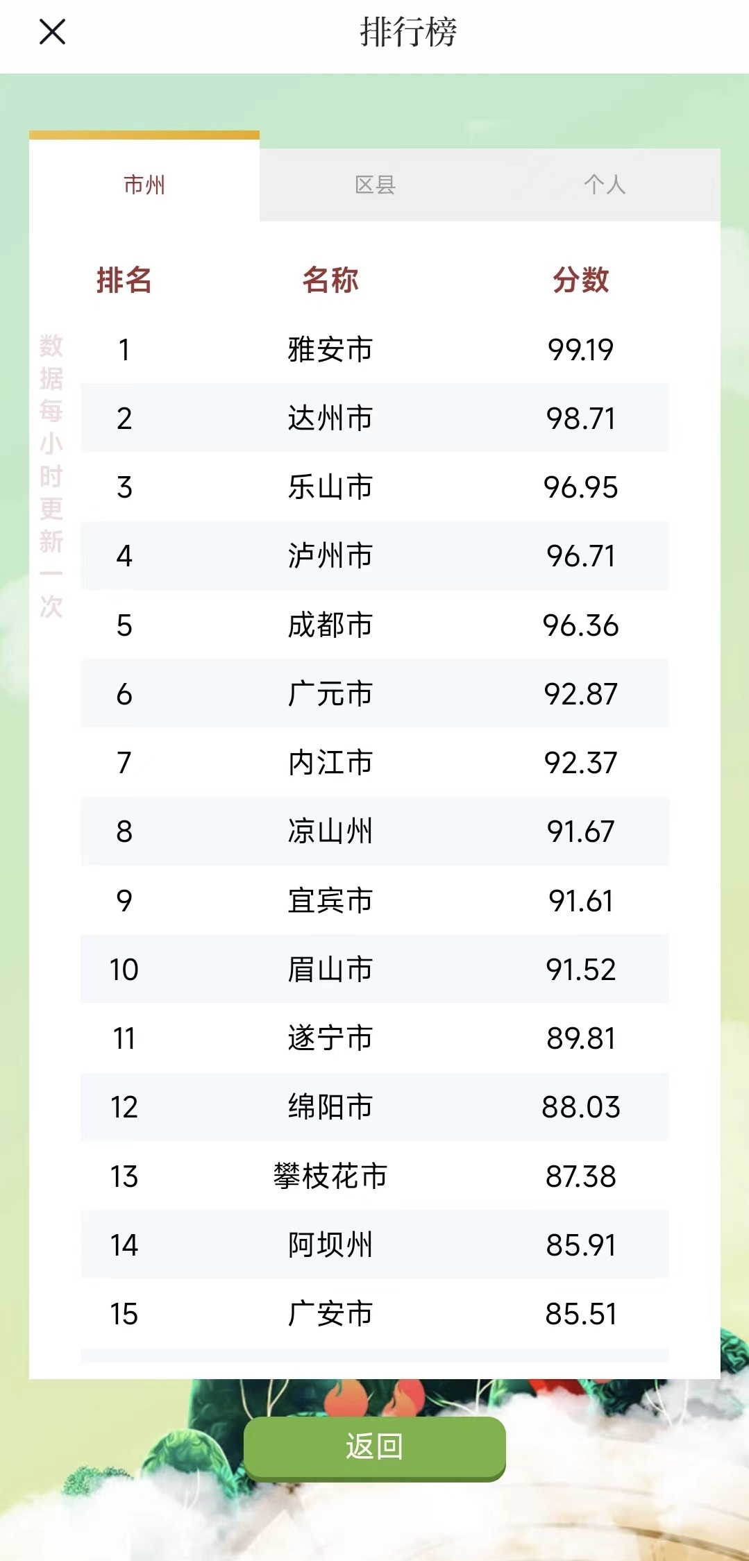 区县排名榜,达州万源市依旧遥遥领先,连续两周稳居榜首。第2名到第15名之间,各区县比分紧咬,榜单上涌现出了一些新成员,例如乐山市金口河区和成都市青羊区。值得一提的是,达州万源市和大竹县占据榜单前两位。