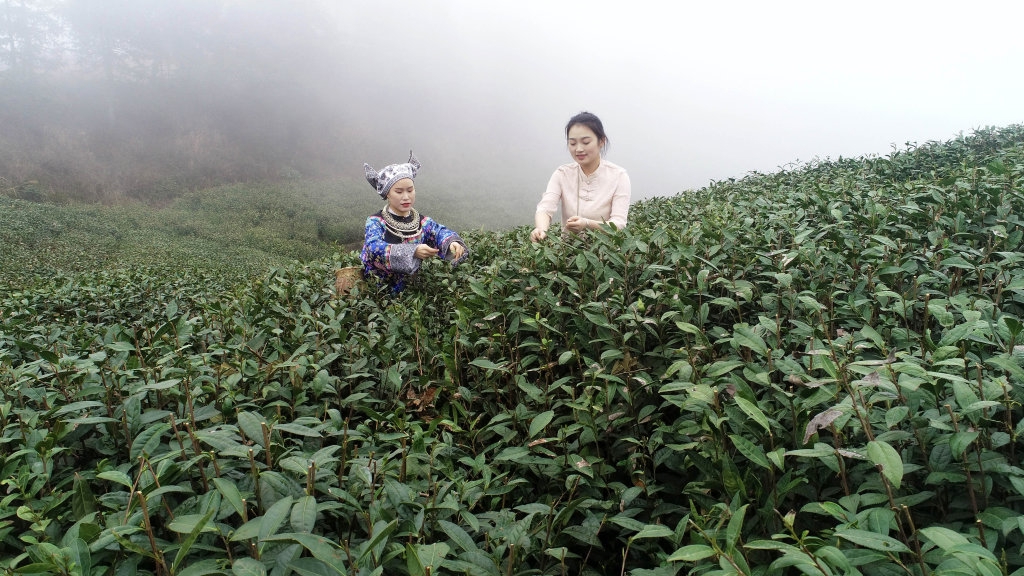 3月17日,茶农在贵州省黔东南苗族侗族自治州雷山县丹江镇一处茶园采茶(无人机照片)。