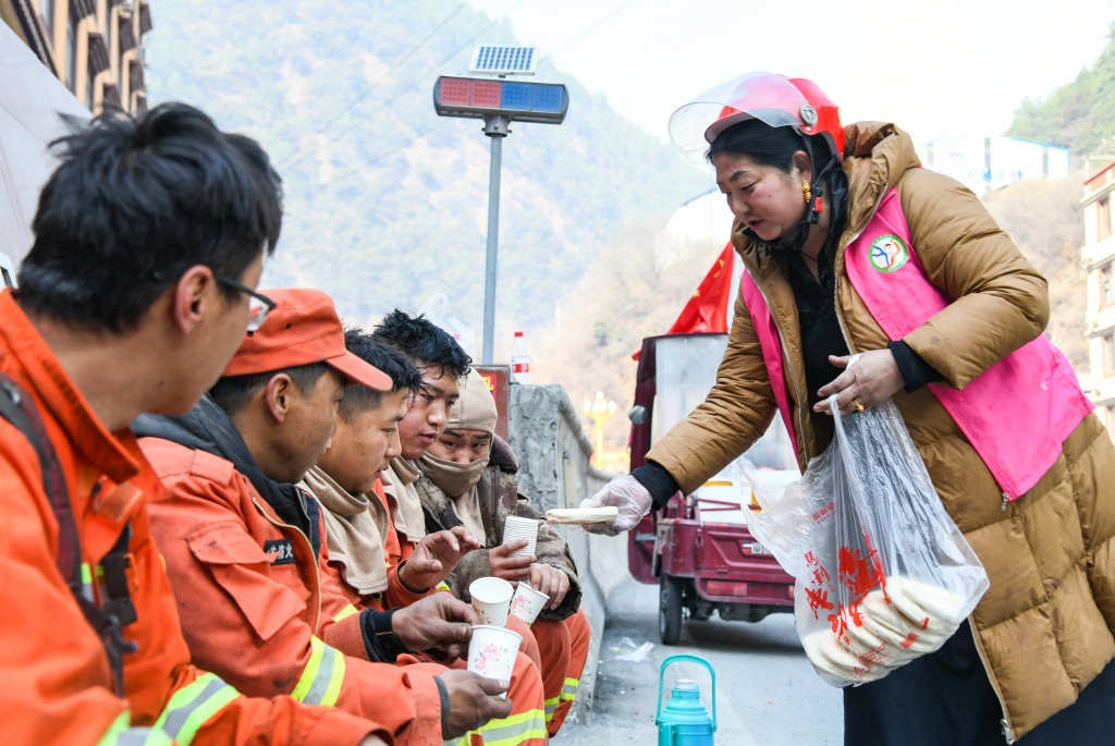 3月18日,在四川省甘孜藏族自治州雅江县,彭三妹(右)为刚从火场撤下来的消防员送上馍馍和热水。