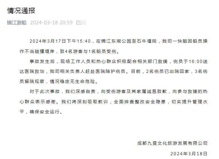 2024年3月17日下午15:40,在锦江东湖公园至石牛堰段,我司一快艇因船员操作不当碰撞堤岸,致4名游客与1名船员受伤。事故发生后,现场工作人员和热心群众积极配合相关部门救援,伤员于16:00送达医院救治,我司相关负责人赶赴医院陪护伤员。目前,2名伤员已出院回家,3名伤员留院观察,情况稳定无生命危险。对于此次事故,我们深感自责,向受伤游客及其家属诚恳致歉,向参与救援的热心群众表示感谢。我们将深刻吸取教训,全面排查整改安全隐患,切实提升管理水平,确保安全运行。
