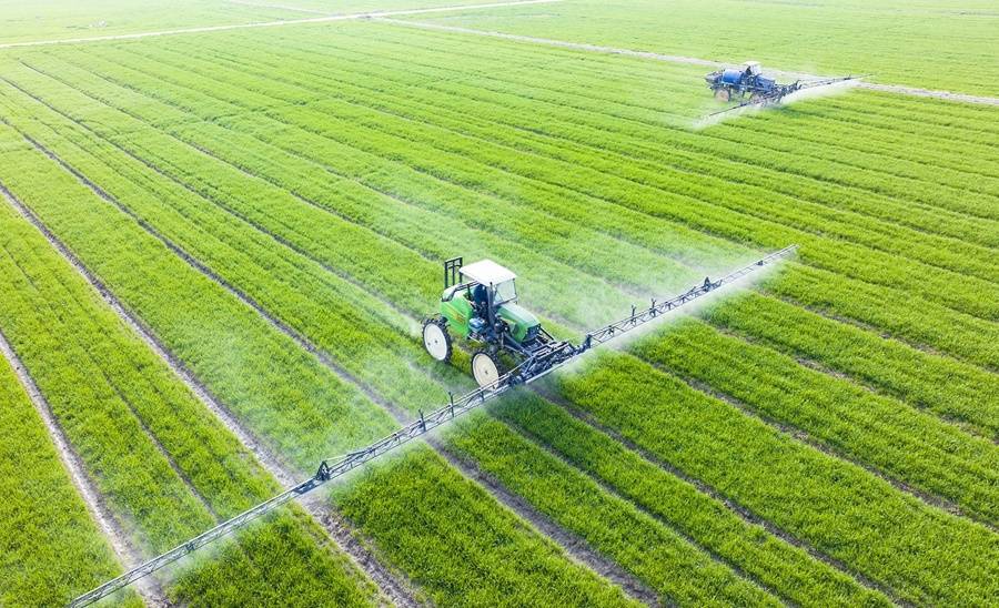 3月19日,在江苏省海安市大公镇王院村,村民驾驶植保机械在田间进行喷洒药物作业(无人机照片)。新华社发(翟慧勇摄)