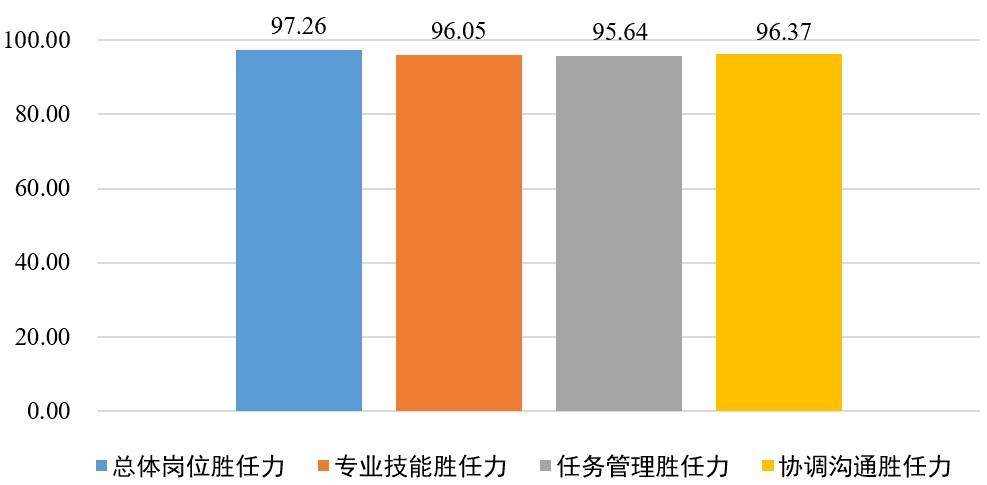 从岗位胜任力看,2023届高校毕业生的总体岗位胜任力为97.26%。其中,专业技能胜任力为96.05%,任务管理胜任力为95.64%,协调沟通胜任力为96.37%。