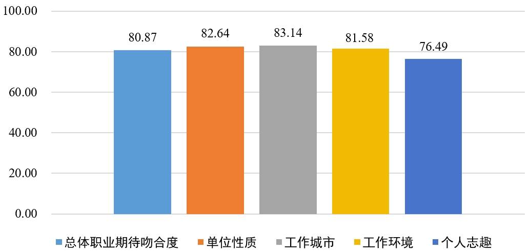 从职业期待吻合度看,2023届高校毕业生的总体职业期待吻合度为80.87%。其中,单位性质的职业期待吻合度为82.64%,工作城市的职业期待吻合度为83.14%,工作环境的职业期待吻合度为81.58%,个人志趣的职业期待吻合度为76.49%。