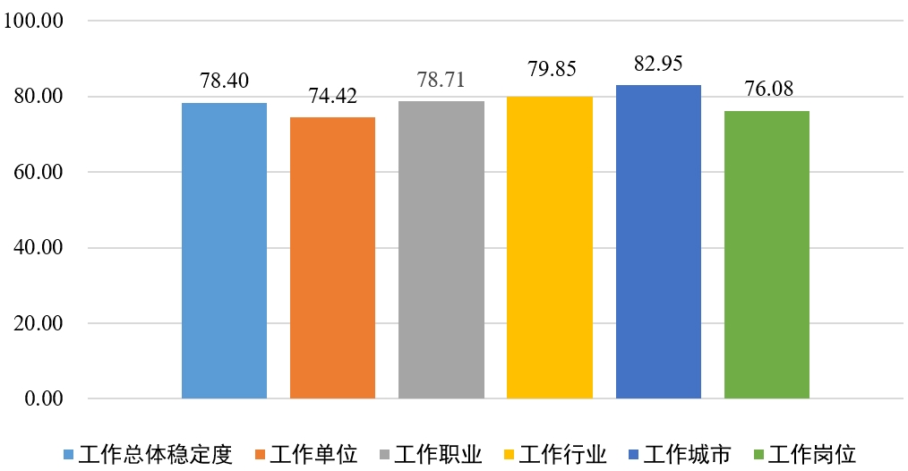 从工作稳定度看,2023届高校毕业生毕业半年的工作总体稳定度为78.40%。其中,工作单位的稳定度为74.42%,工作职业的稳定度为78.71%,工作行业的稳定度为79.85%,工作城市的稳定度为82.95%,工作岗位的稳定度为76.08%。