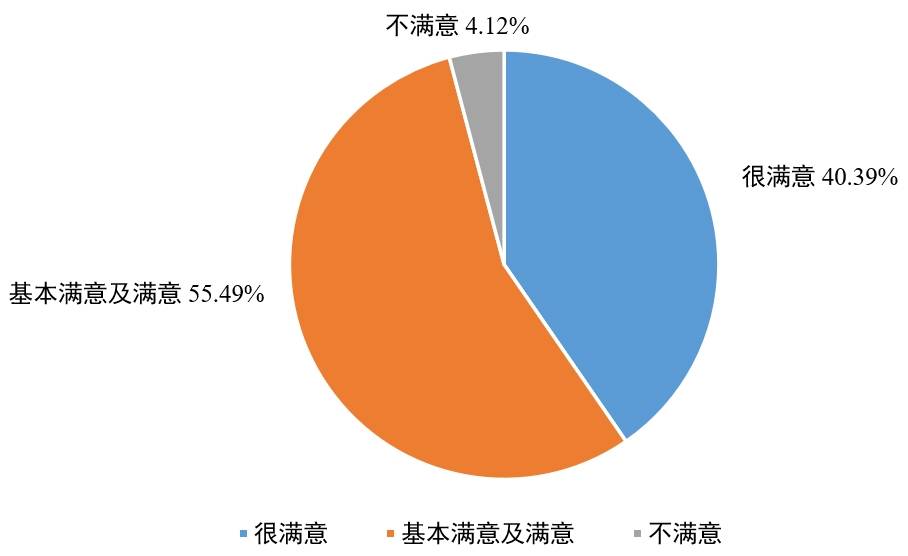 从用人单位调研结果看,用人单位对2023届高校毕业生的满意度普遍较好,基本满意及以上评价达到95.88%。其中,选择很满意的用人单位占40.39%,选择基本满意及满意的用人单位占55.49%,选择不满意的用人单位占4.12%。