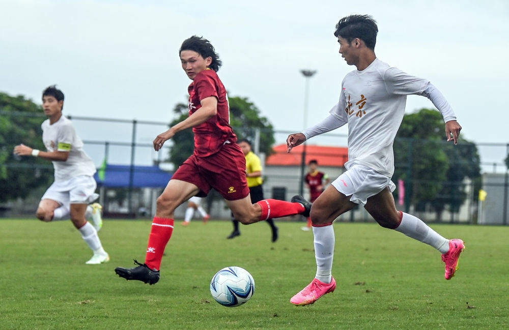 2023年11月8日,在第一届学生(青年)运动会足球项目大学男子组小组赛第二轮比赛中,北京队以2:0战胜重庆队。图为北京队球员钱诚(右)在比赛中带球突破。新华社记者 张爱林 摄