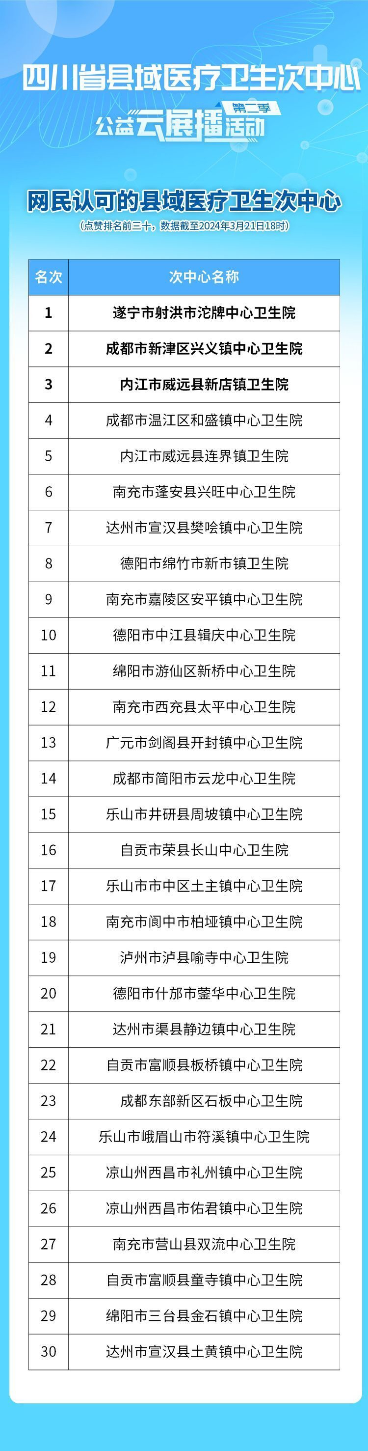 为让网友们在基层就医更便利,让群众了解身边的基层医疗卫生服务的新面貌、新变化,宣传四川省乡村卫生体系建设的亮点做法和成效——3月12日至3月25日,由省卫生健康委、川观新闻联合开展第二季 “四川省县域医疗卫生次中心公益云展播活动”,四川第二批135个次中心集体亮相。