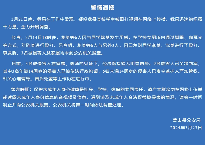 3月21日晚,我局在工作中发现,疑似我县某校学生被殴打视频在网络上传播,我局迅速组织精干力量,全力开展调查。