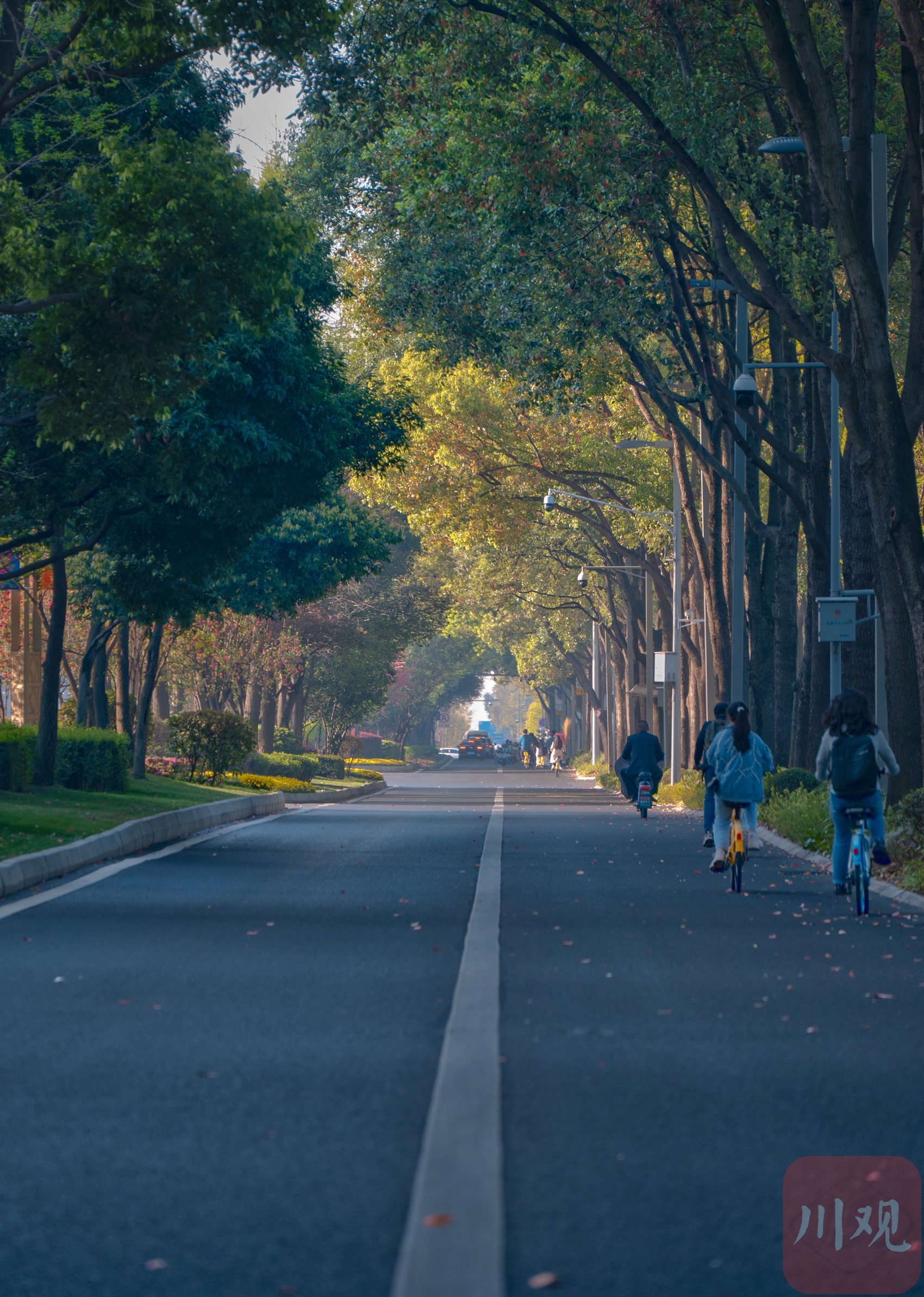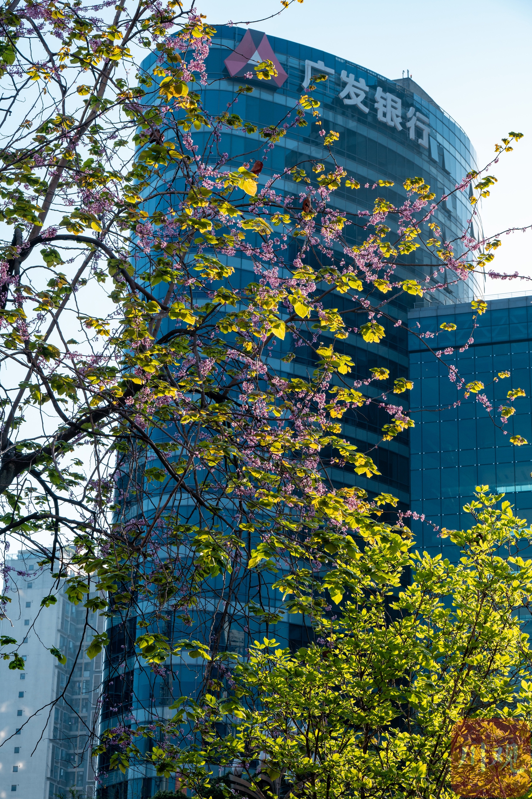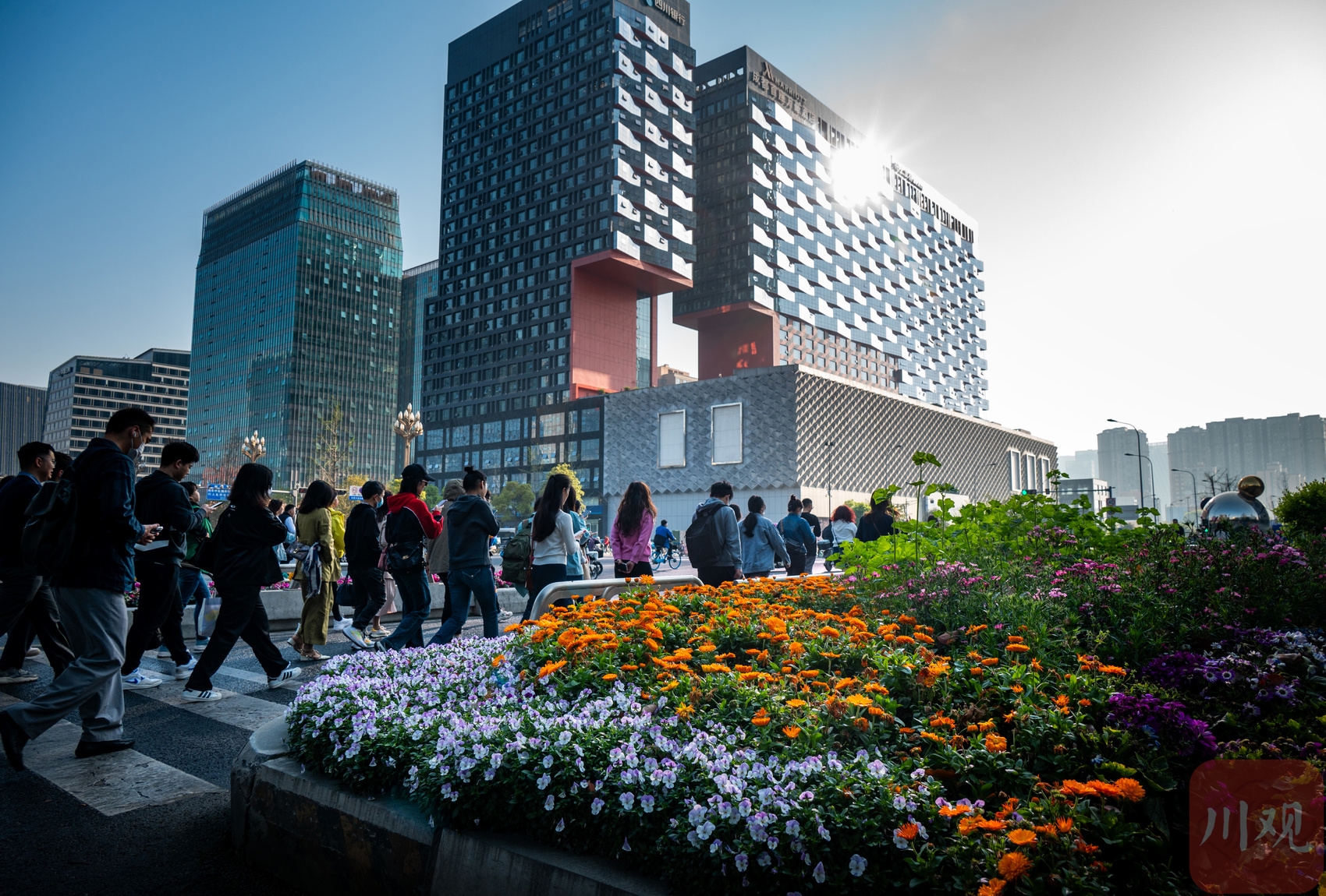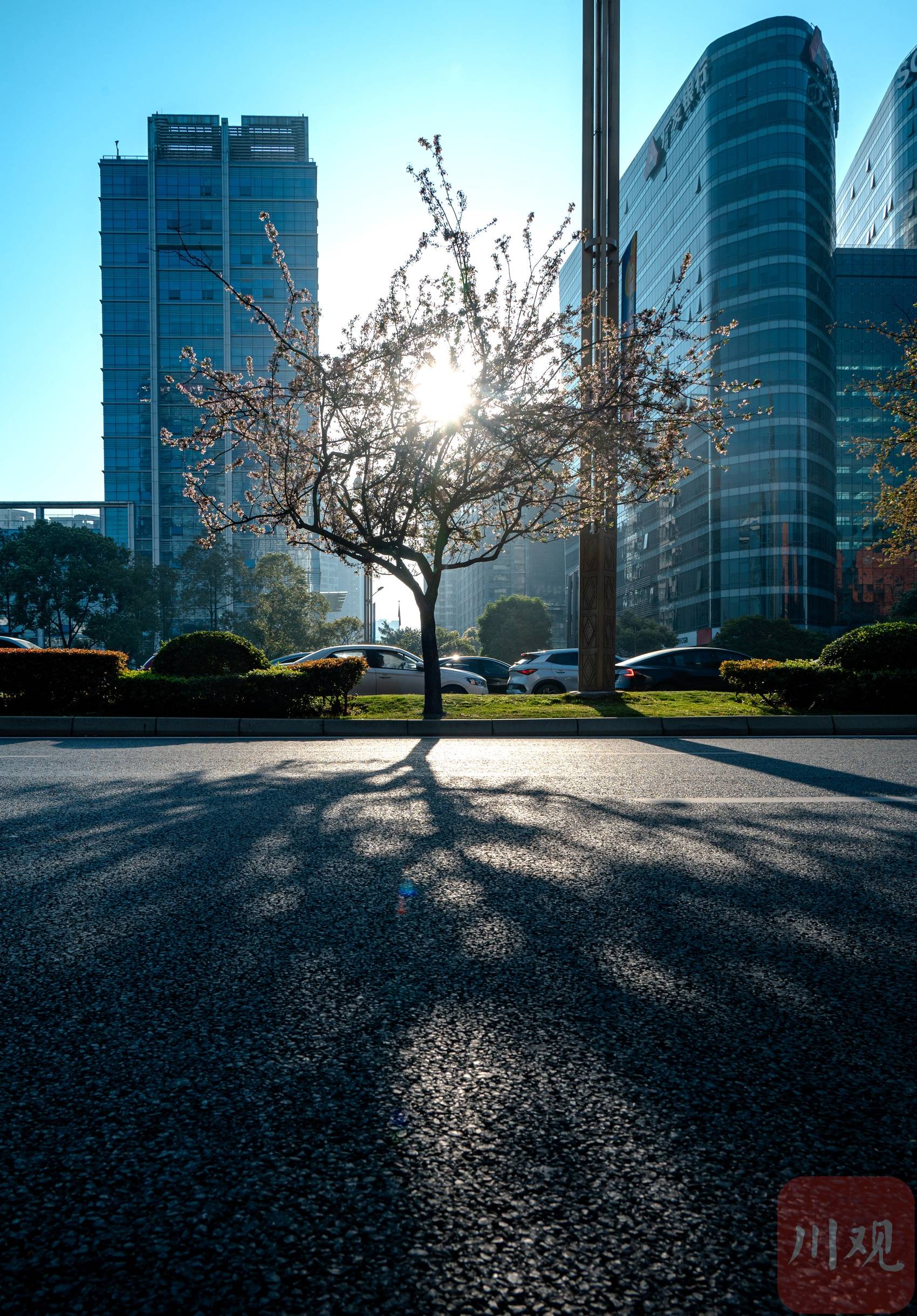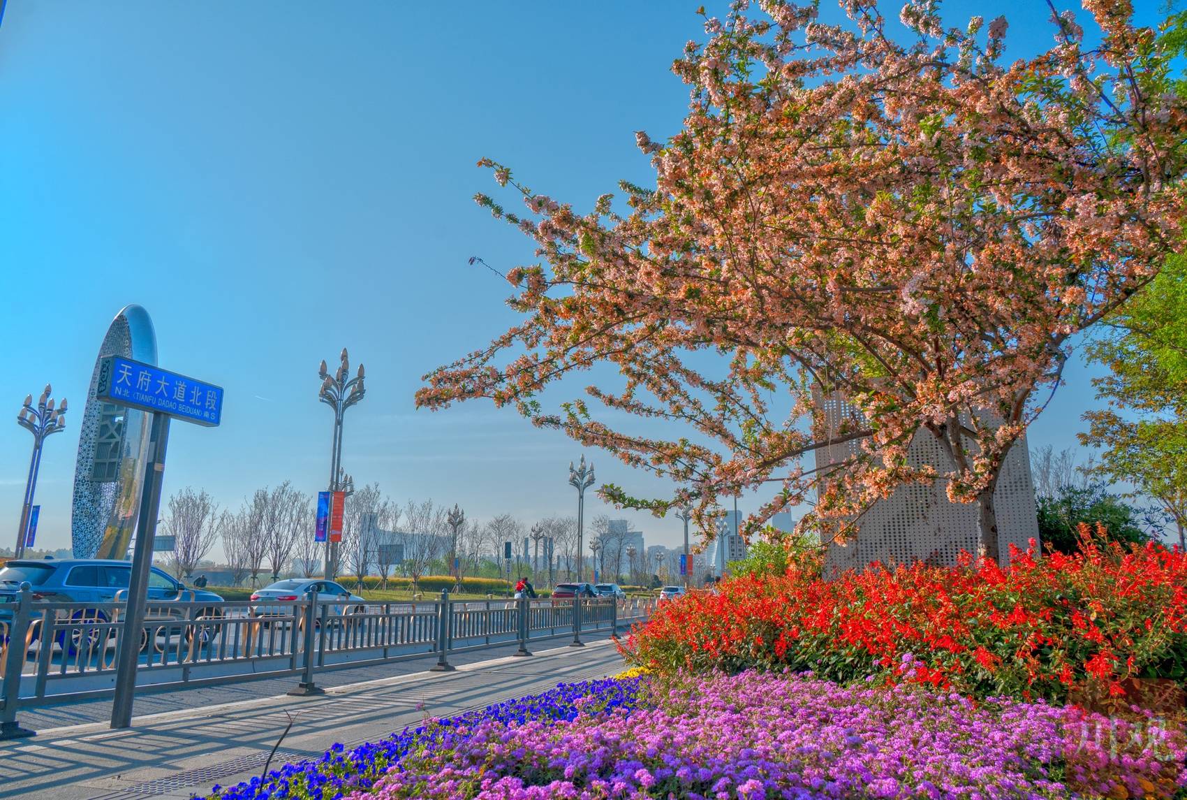 3 月 31 日,在春光中,沿着成都市天府大道一路向南,道路两旁的樱花、红梅、玉兰花已经盛开,行道树已经发出绿芽,走在城市的中轴线上邂逅春天。