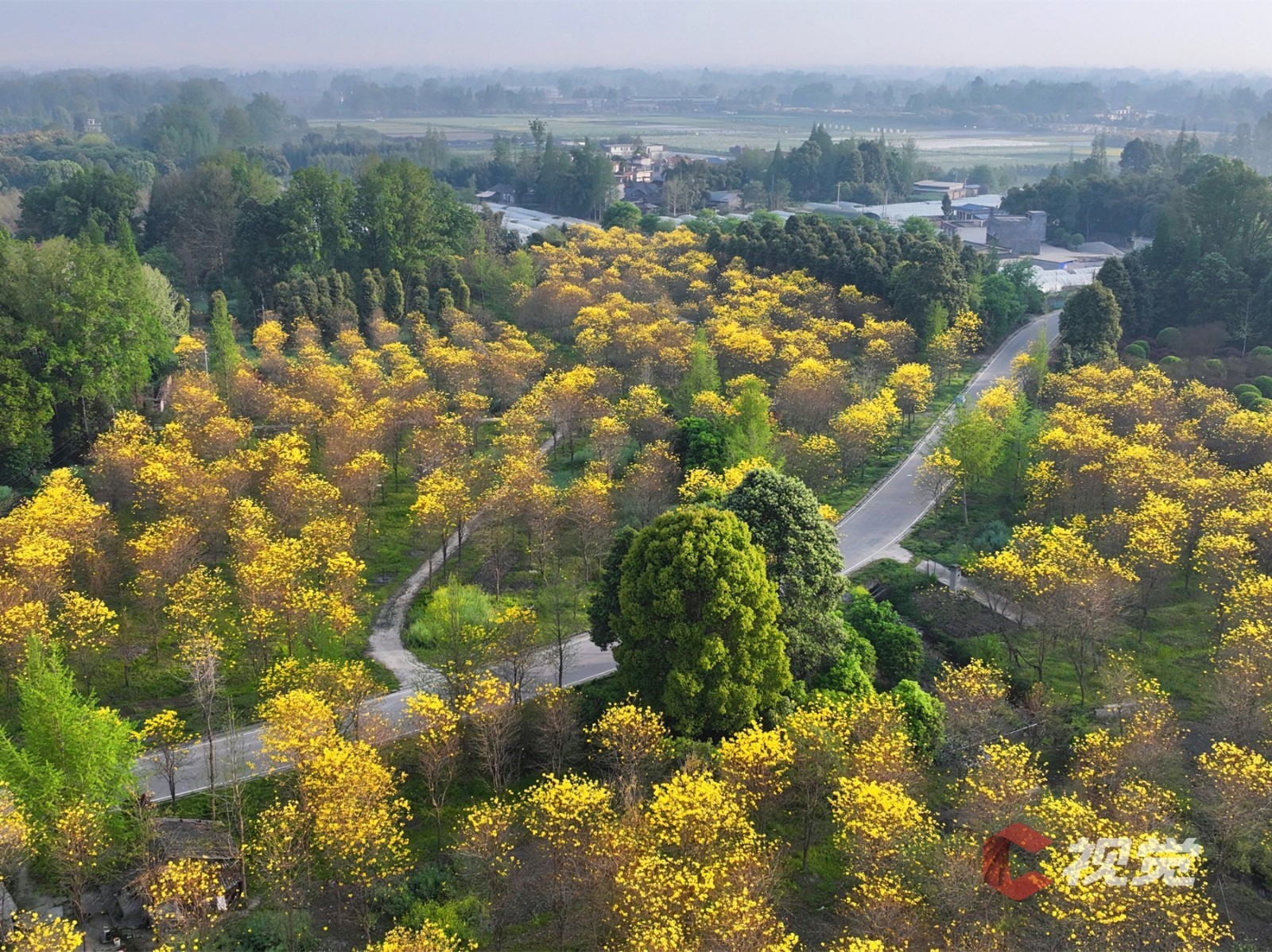 4月2日,崇州市羊马街道福田村的300多亩7000余株黄花风铃木迎来盛花期,在晨光的照耀之下,“金”上加“金”,勾勒出一幅灿烂的田园画卷。