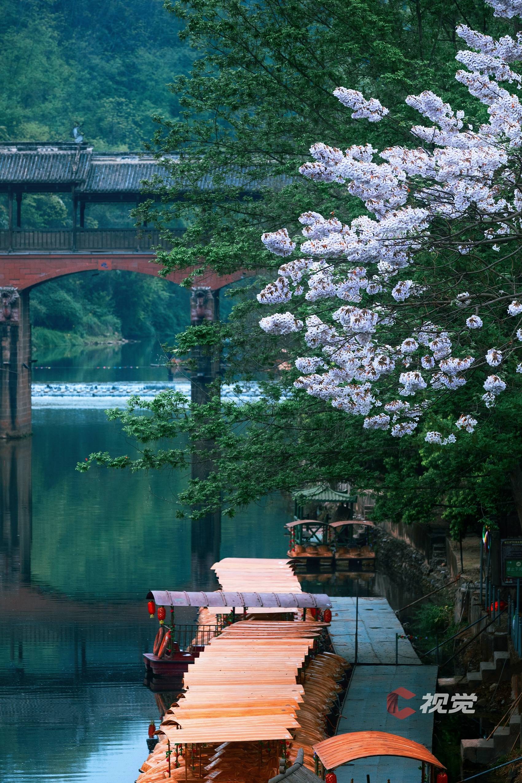 而在街子古镇,另一种“粉紫色浪漫”也在上演,古镇里的泡桐花正值花期,粉紫色花朵满簇绽放,与古街、古桥相映成景,吸引着游客前来,留下这春日美好的记忆。