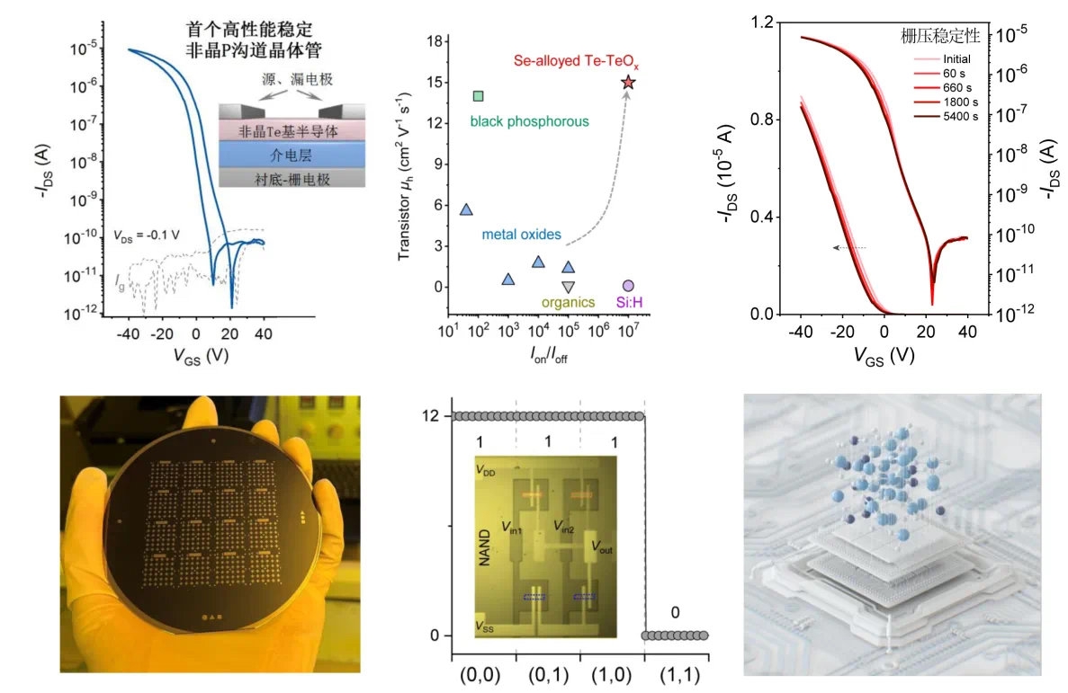 这些器件展现了良好的偏置应力和环境稳定性,以及晶圆尺度的均匀性。该碲基材料体系在性能上远优于已报道的其他新兴非晶P型半导体材料,并展现出卓越的经济性、稳定性、可扩展性和加工性,其制备工艺与工业生产线和后端集成技术完美兼容。同时,为设计新一代稳定的非晶P型半导体材料带来了新的启发。这项研究将开启P型半导体器件的研究热潮,并在建立商业上可行的非晶P沟道TFT技术和低功耗CMOS集成器件迈出了重要一步。