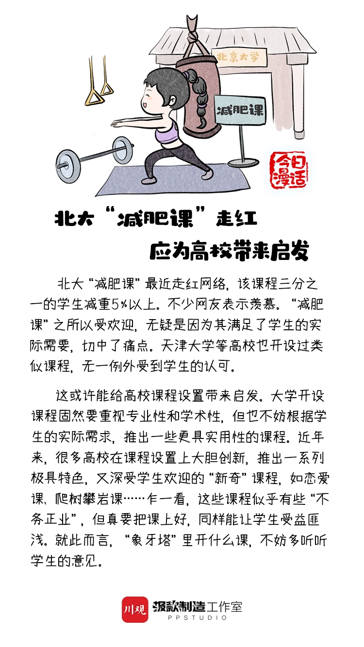 最近,北大“减肥课”走红,该课程三分之一的学生减重5%以上。不少网友羡慕地“求网课”“求跨校选课”。“减肥课”之所以受欢迎,无疑是因为其满足了学生的实际需要,切中了痛点。对此,你怎么看?