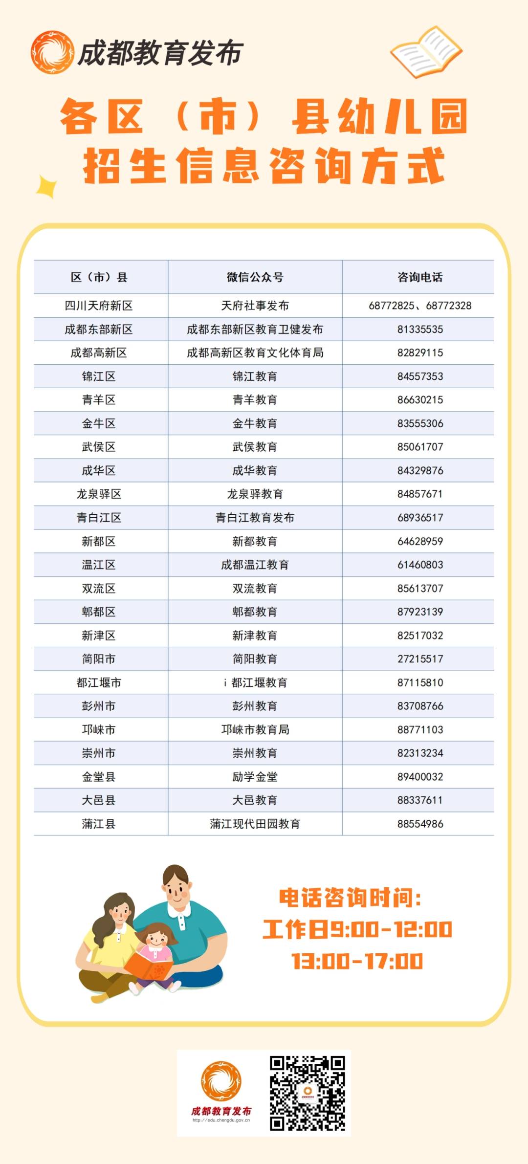 家长可通过成都市教育局及各区(市)县教育行政部门官方微信公众号、网站查询今年招生入园相关政策要求,了解报名时间、报名条件、报名流程等信息。如查询后仍有问题需要咨询,家长可拨打各区(市)县教育行政部门招生咨询电话进行咨询。(后附招生信息咨询方式)